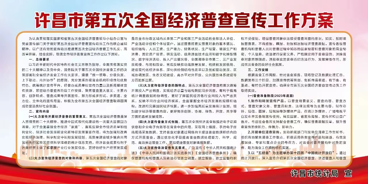 为扎实做好全市民政系统第五次全国经济普查宣传工作,充分发挥宣传动员作用,营造良好舆论氛围,近日,许昌市民政局印发《第五次全国经济普查宣传工作方案》(以下简称《方案》),明确了经济普查宣传工作的总体目标、工作任务和具体要求,为普查工作在全市民政系统顺利实施提供了保障。