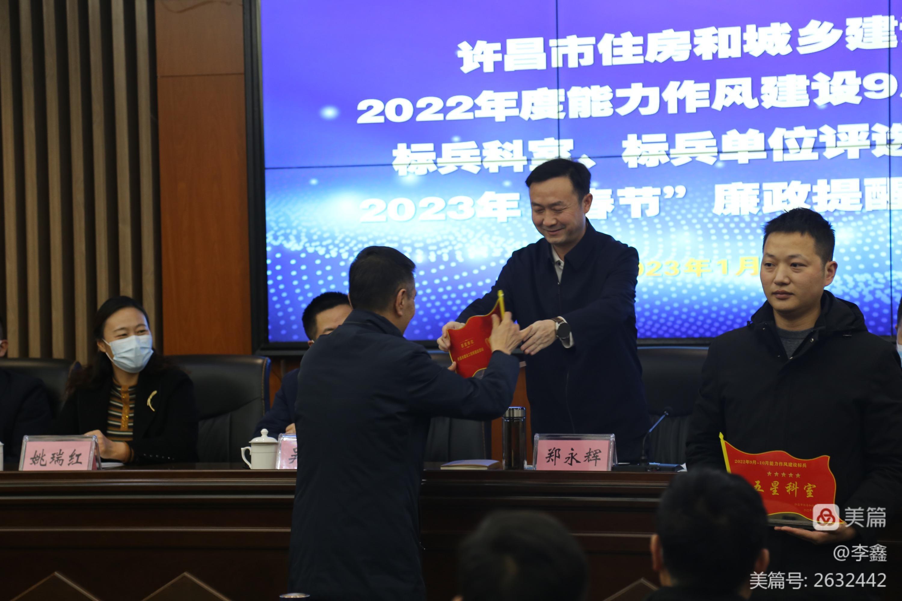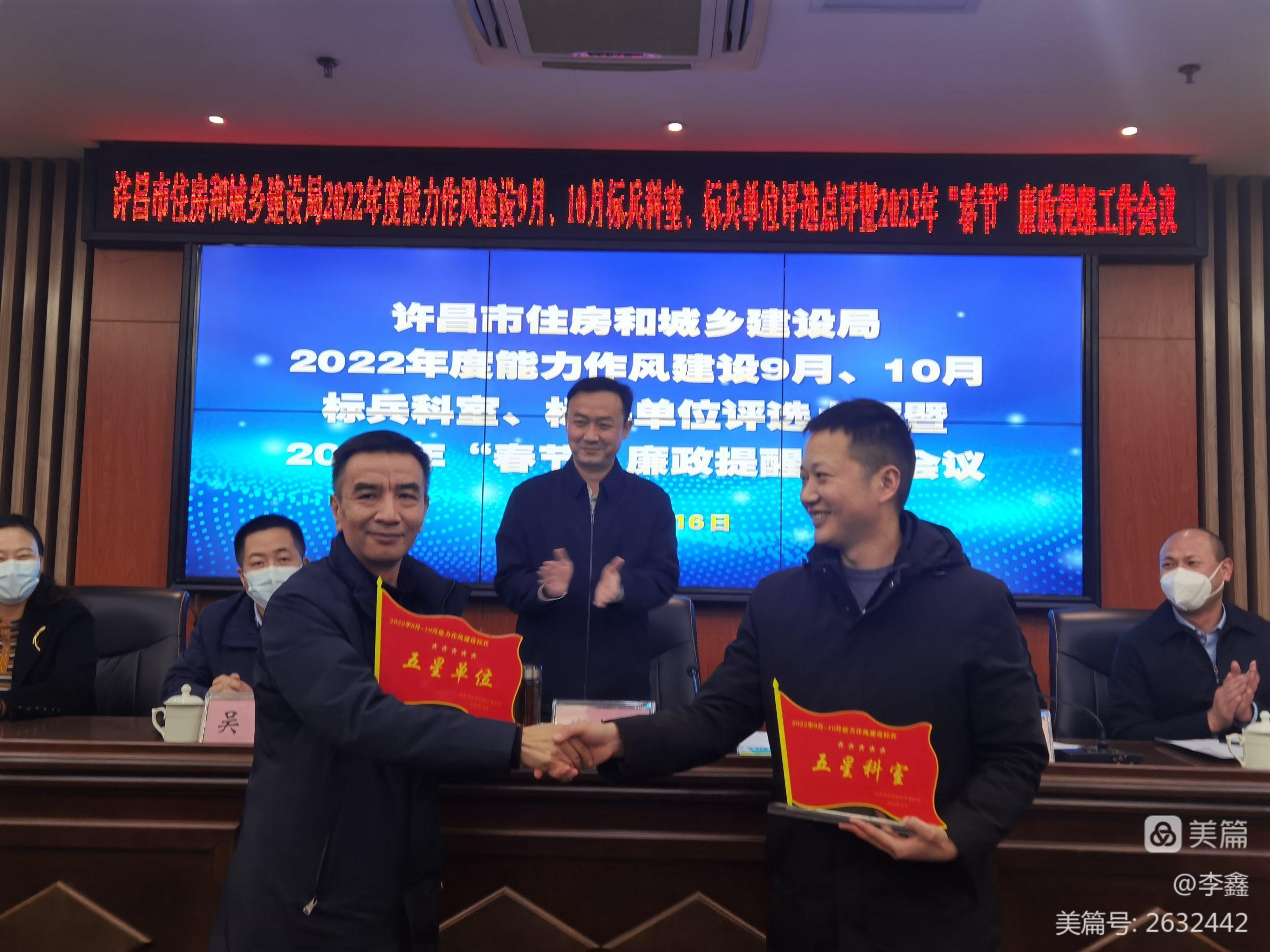 会上,局党组对获得2022年9月、10月“五星、三星、一星”的标兵科室、标兵单位进行了通报表扬,局党组书记、局长郑永辉同志分别向获得“五星级标兵科室”“五星级标兵单位”的局政策法规科、局属事业单位许昌市建设工程质量监督站颁发了奖牌。随后,政策法规科、质量监督站的两位主要负责同志进行了典型发言。