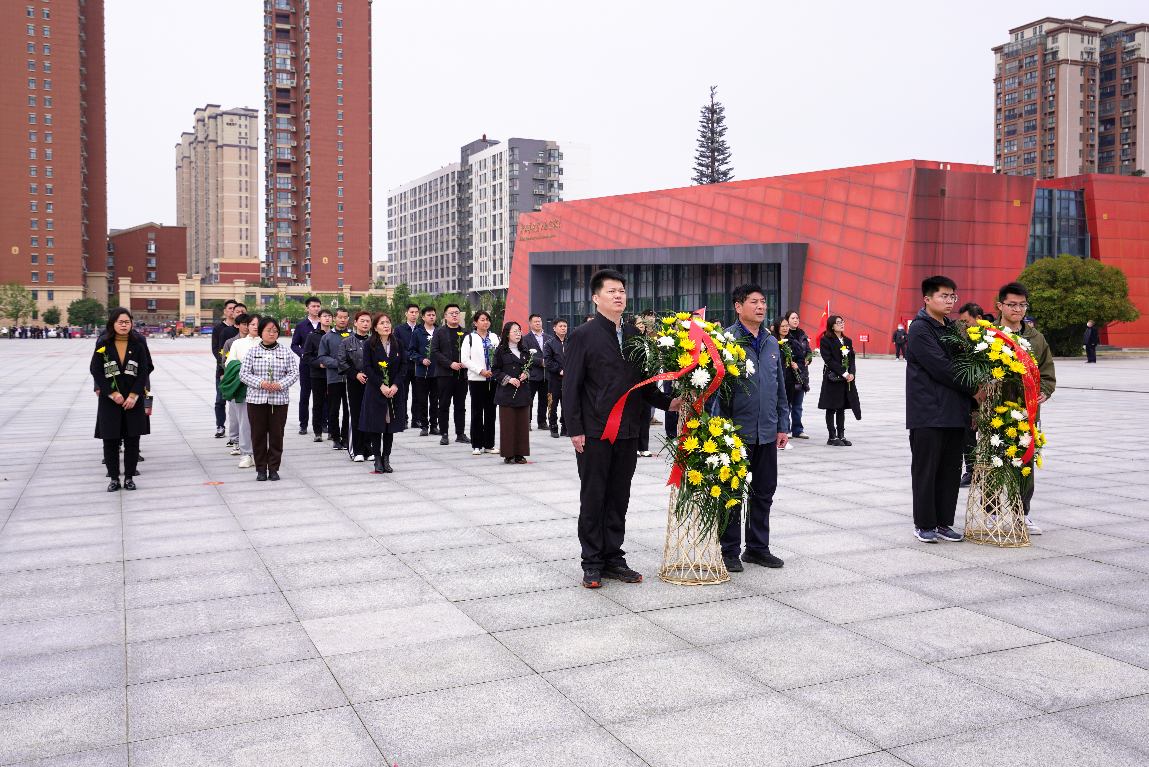 在纪念碑前,全体党员干部整齐排列、庄严静穆,奏唱《中华人民共和国国歌》,怀着无比崇敬的心情向革命烈士纪念碑敬献花篮,肃立默哀,共同表达无尽哀思和敬仰之情。