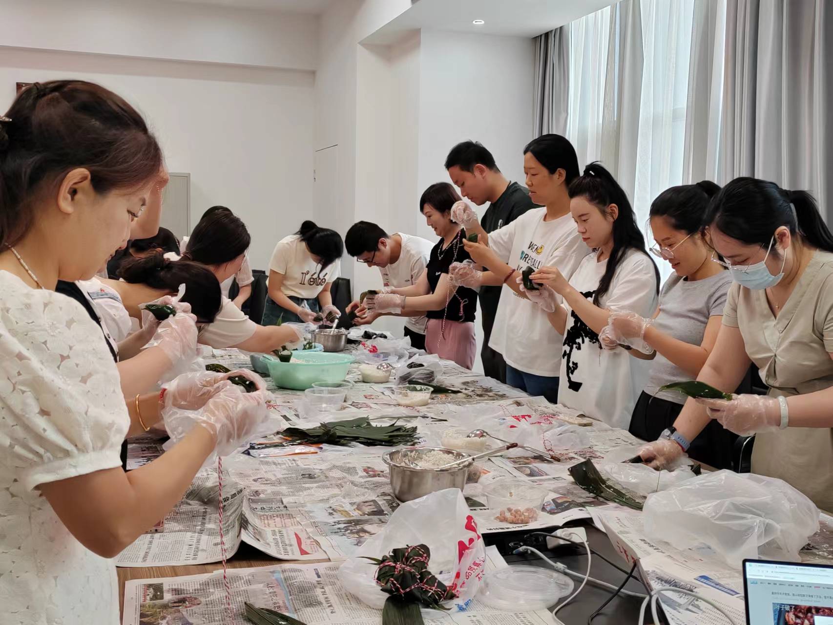 在集体包粽子环节,大家摆放上提前备好的包粽材料,由技术娴熟的同事作示范指导,互相交流着包粽子技巧,忙得不亦乐乎,共同体验劳动的乐趣,在一双双巧手挥动间,一个个独具特色的成品完成。最后,为大家送上充满艾草香气的香囊以作纪念,整个活动现场其乐融融,洋溢着浓浓的节日气氛。