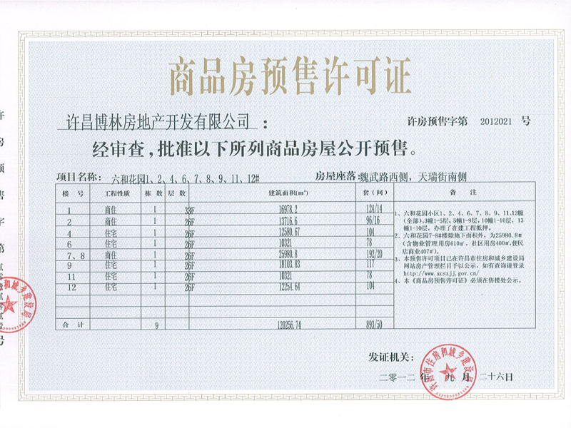许房预售字第2012021号(许昌博林房地产开发有限公司)