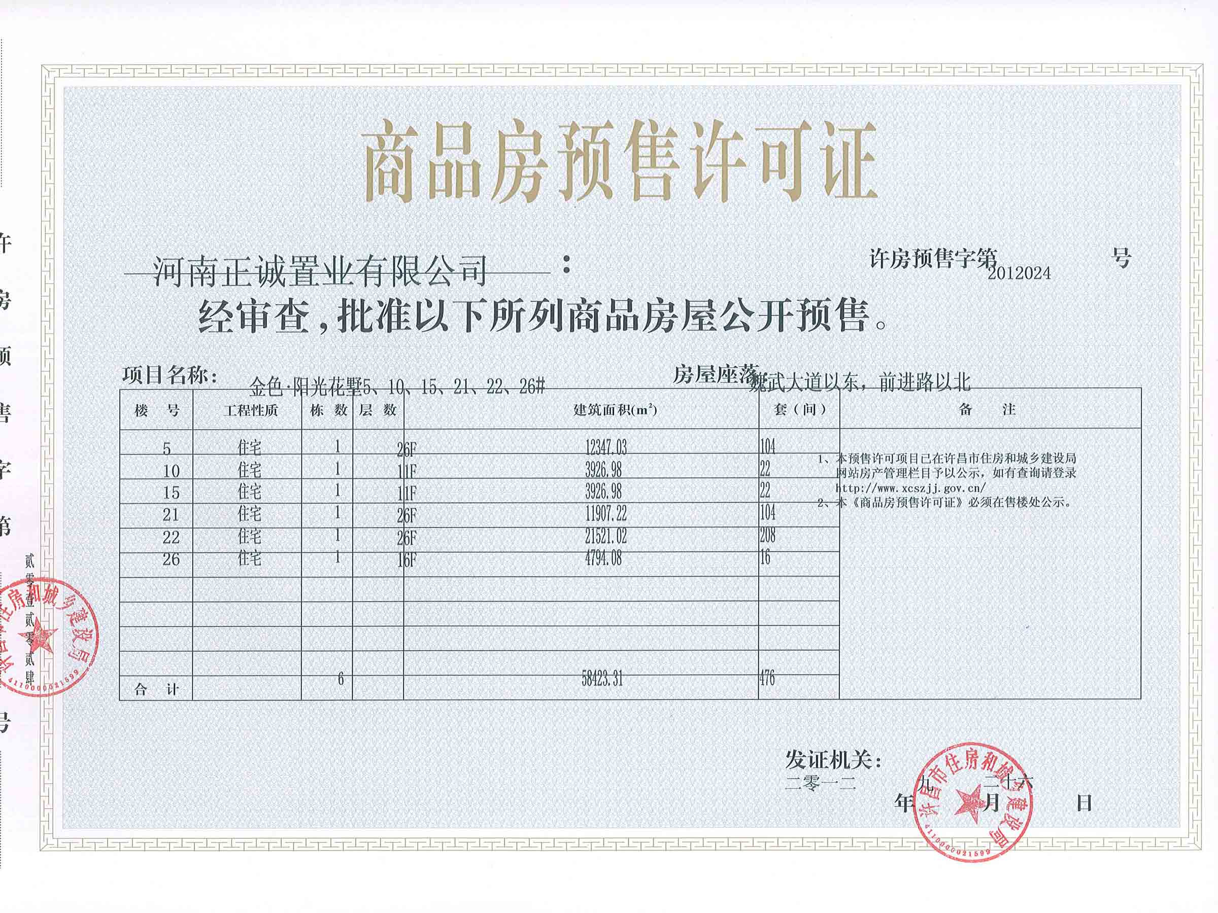 许房预售字第2012024号(河南正诚置业有限公司)
