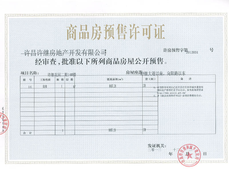 许房预售字第2012031号(许昌许继房地产开发有限公司)