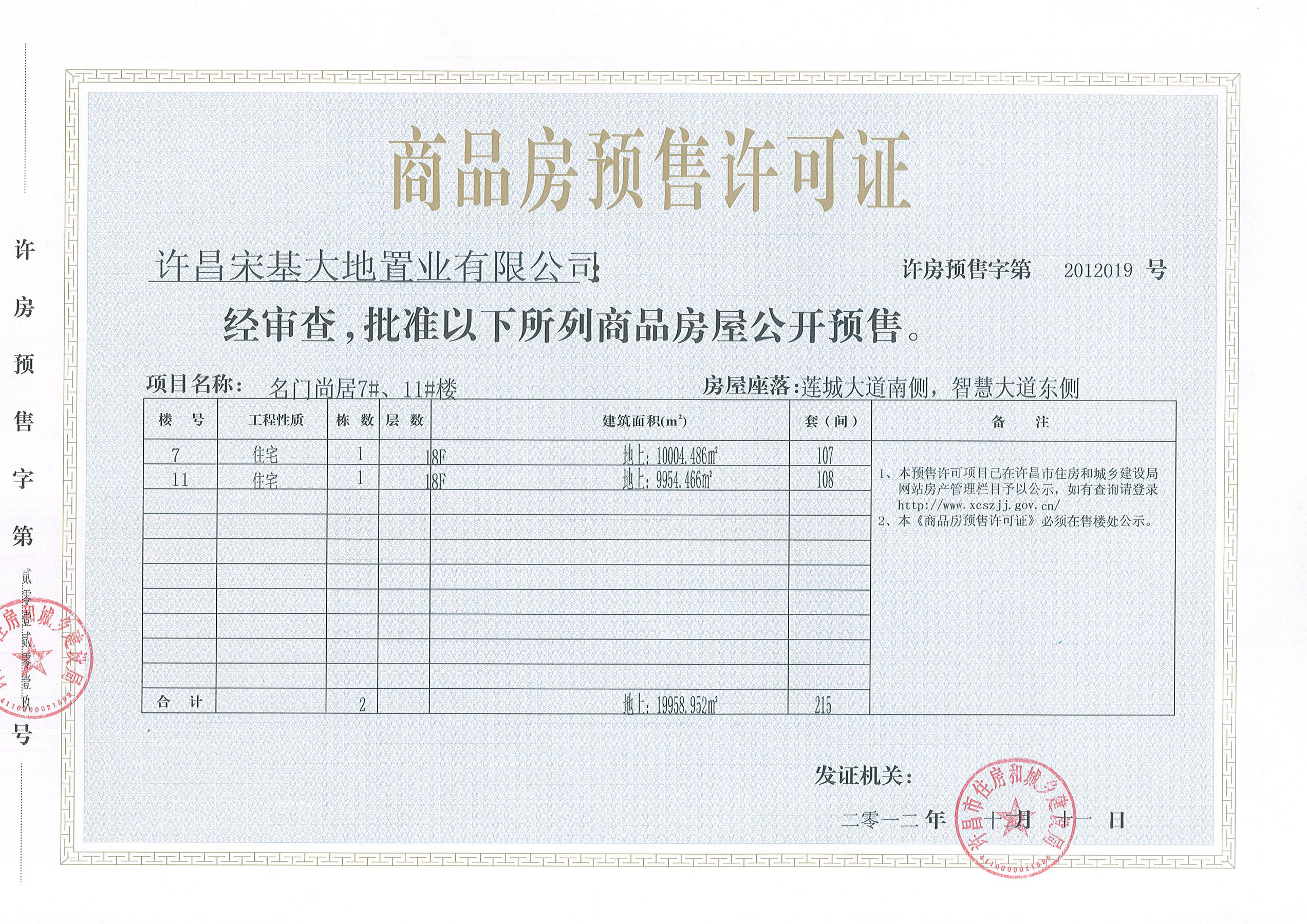 许房预售字第2012019号(许昌宋基大地置业有限公司)