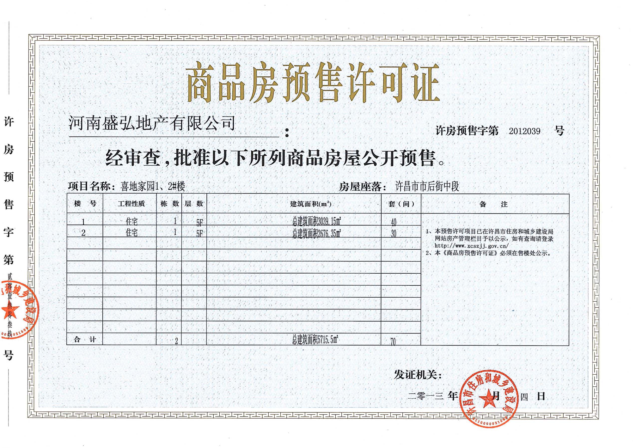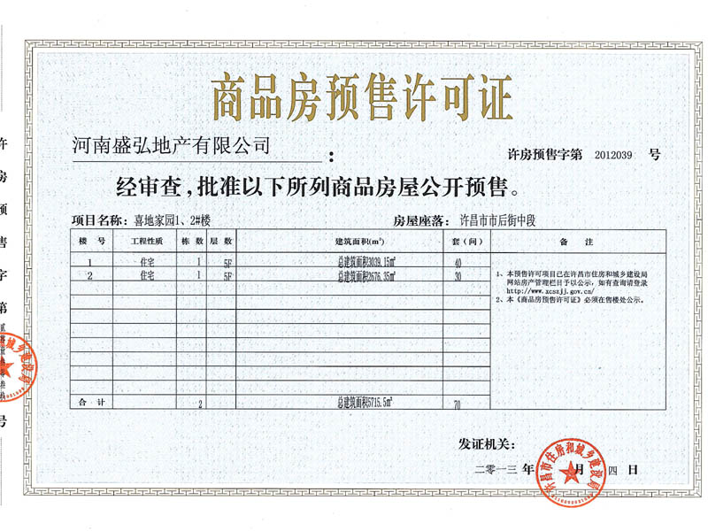 许房预售字第2012039号(河南盛弘地产有限公司)