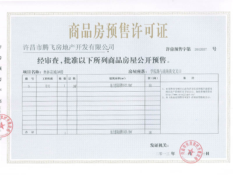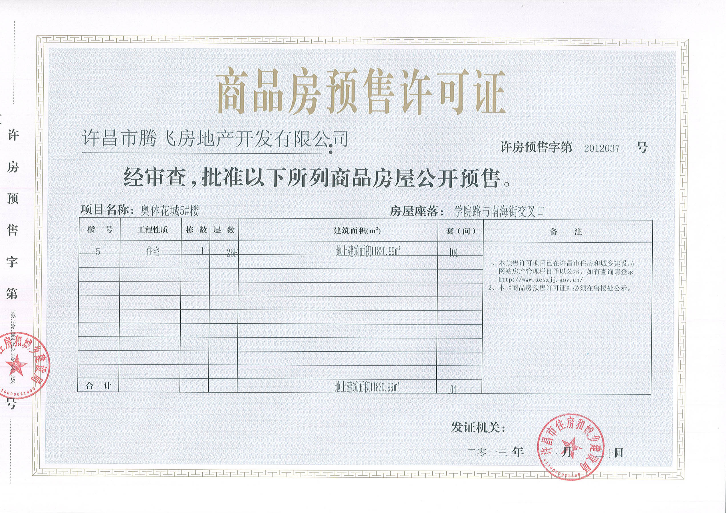 许房预售字第2012037号(许昌市腾飞房地产开发有限公司)