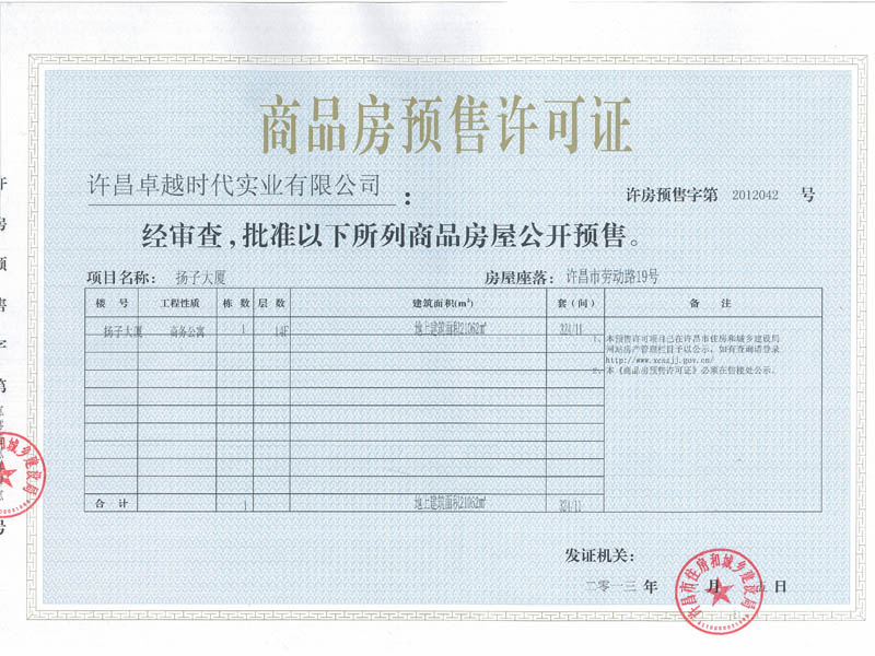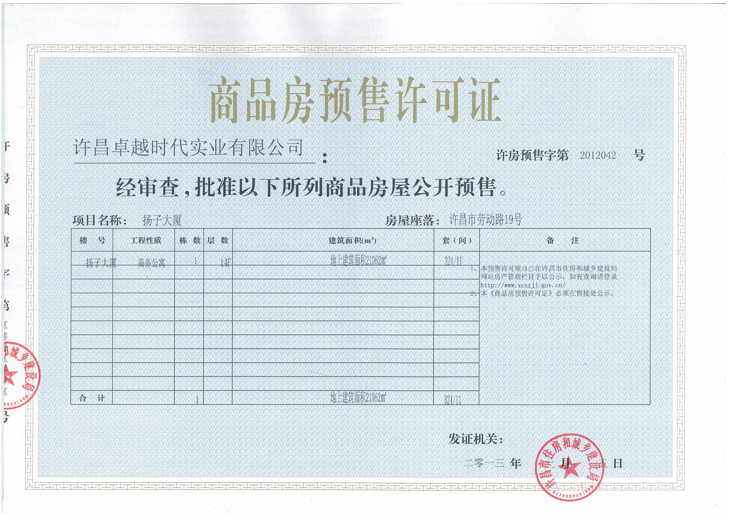 许房预售字第2012042号(许昌卓越时代实业有限公司)