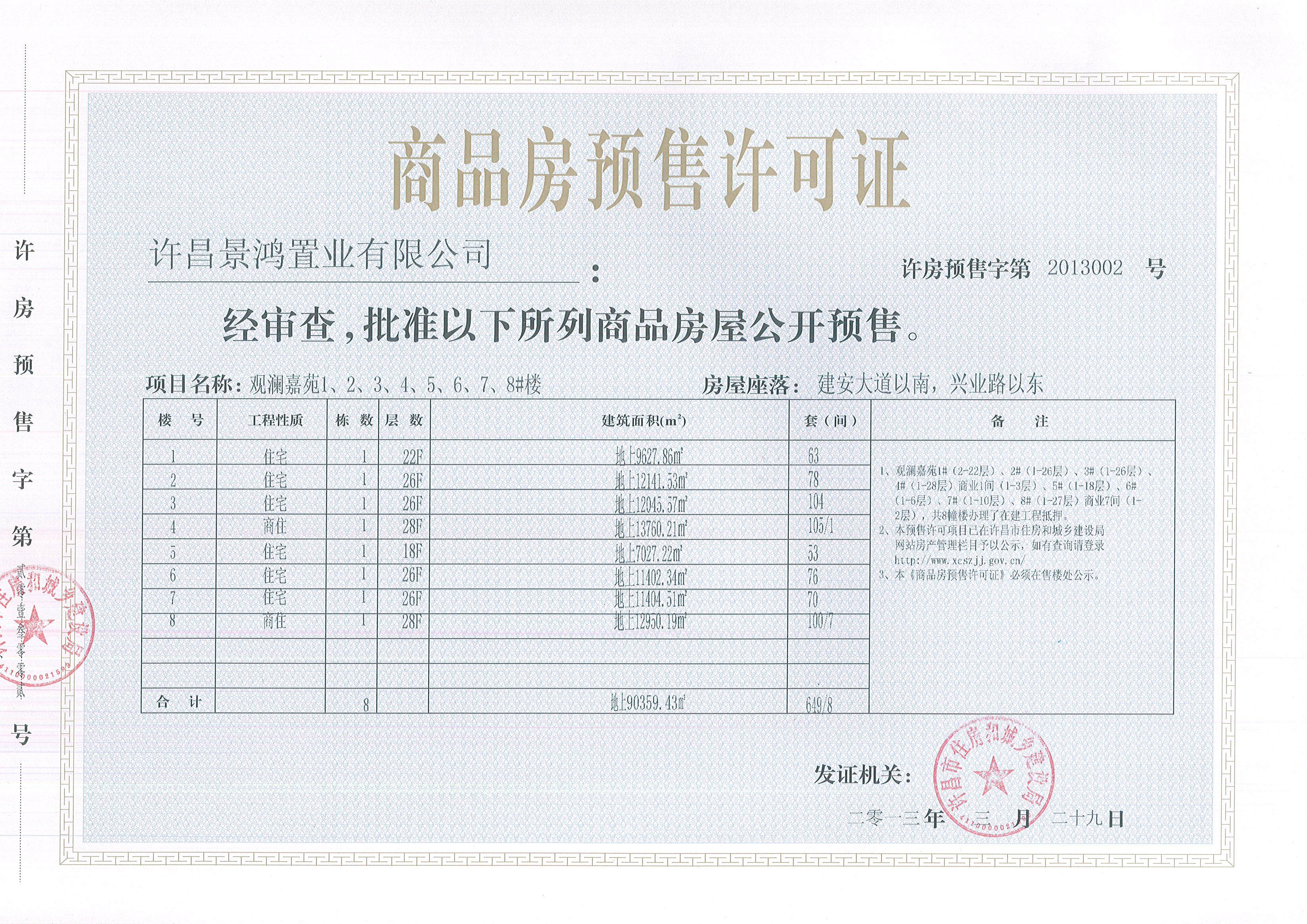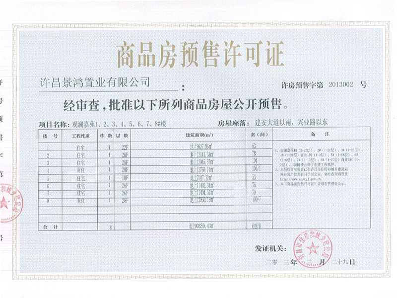 许房预售字第2013002号(许昌景鸿置业有限公司)