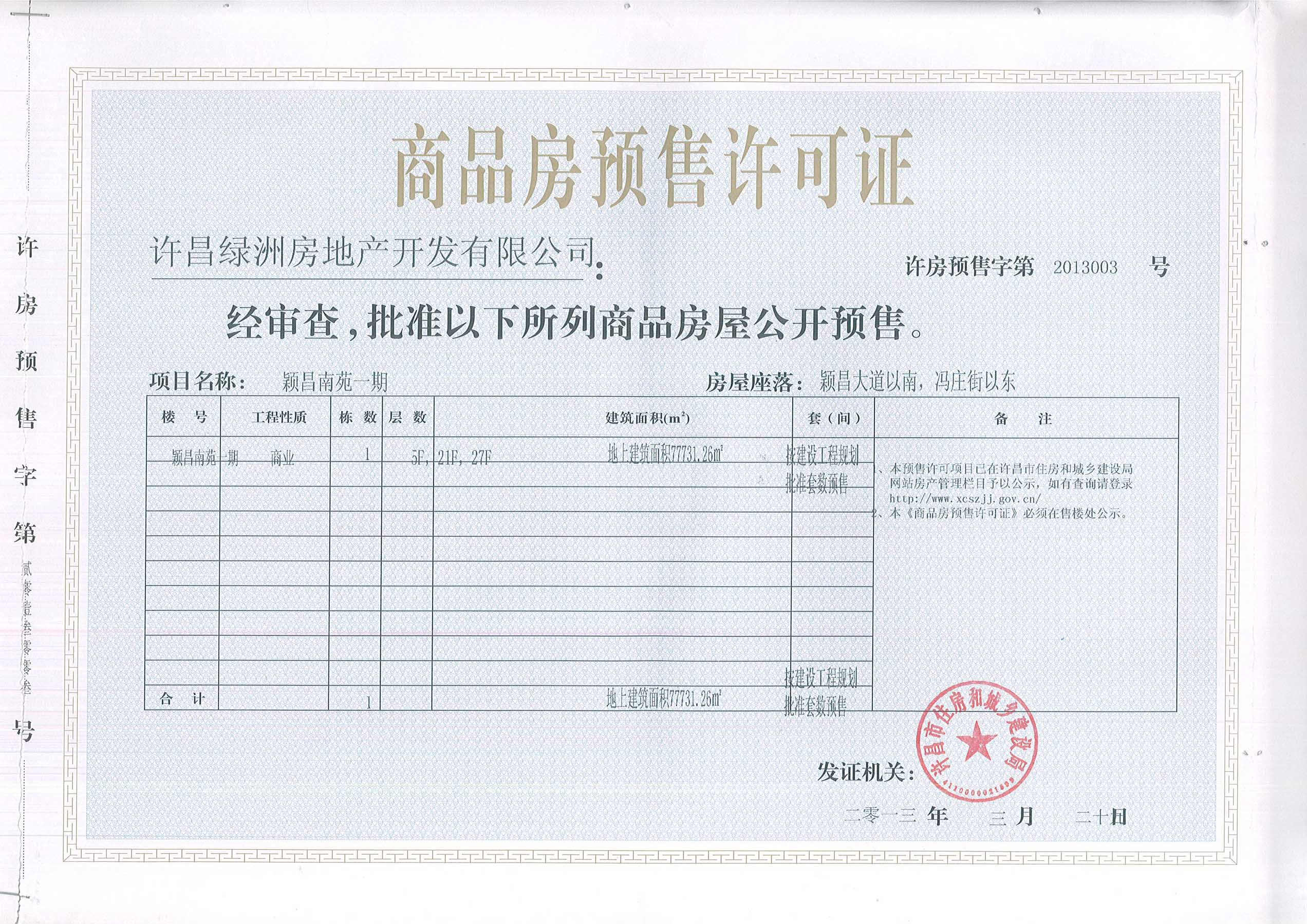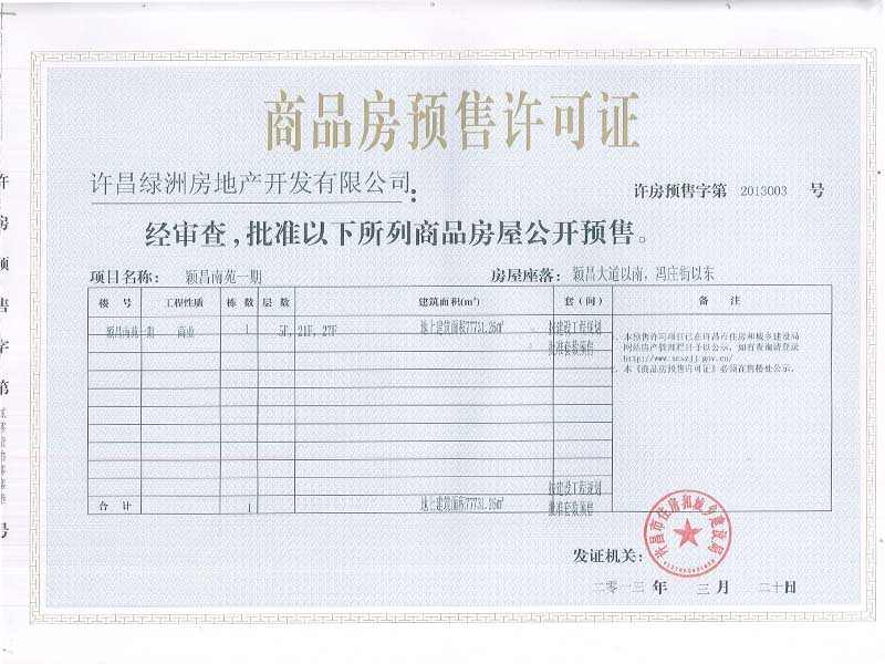 许房预售字第2013003号(许昌绿洲房地产开发有限公司)