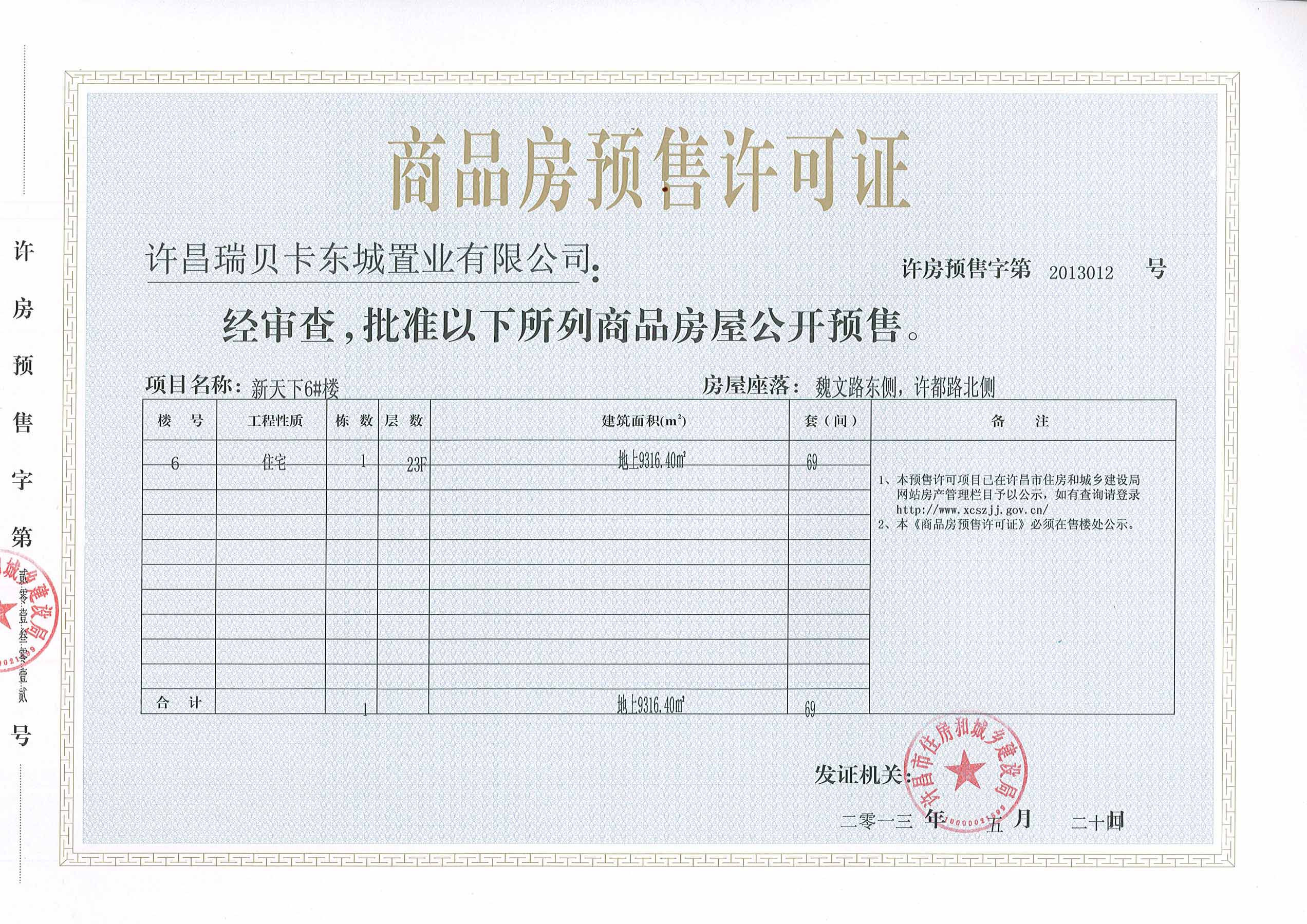 许房预售字第2013012号(许昌瑞贝卡东城置业有限公司)