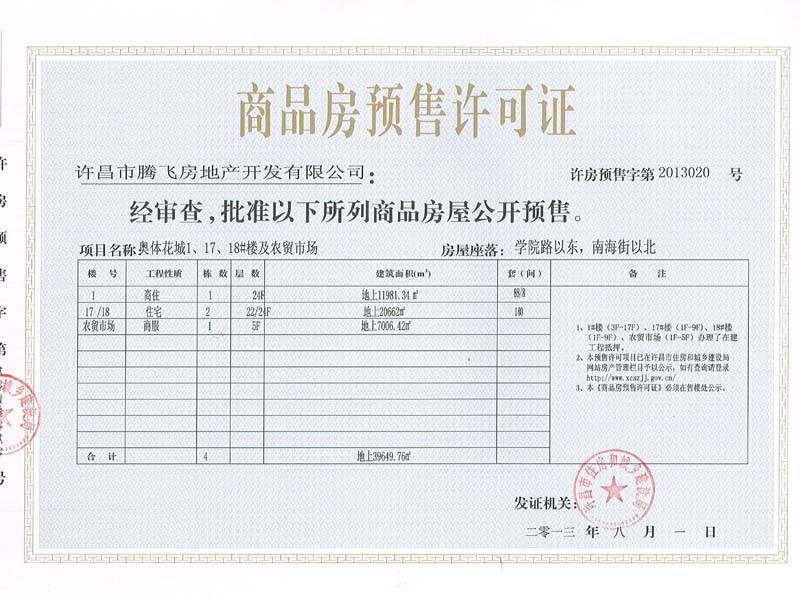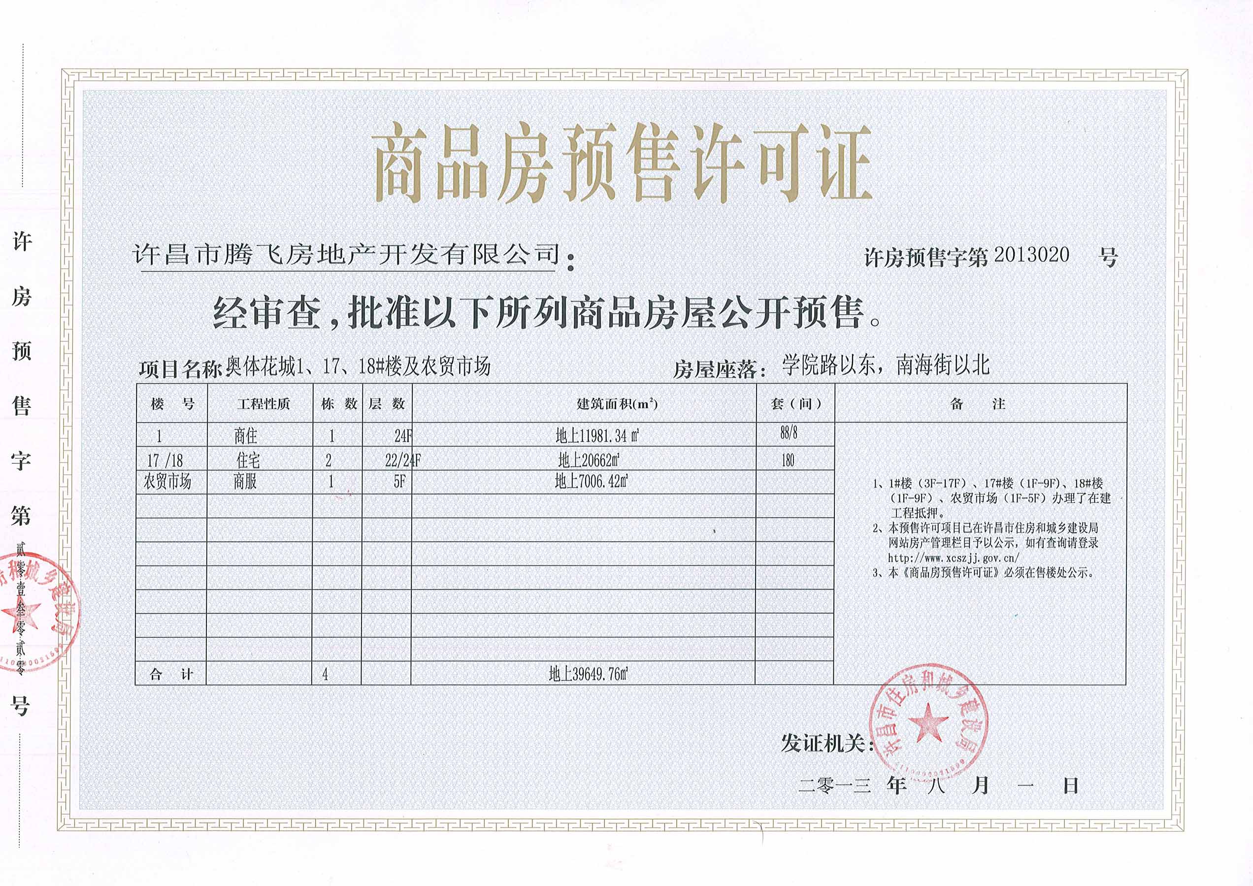 许房预售字第2013020号(许昌市腾飞房地产开发有限公司)