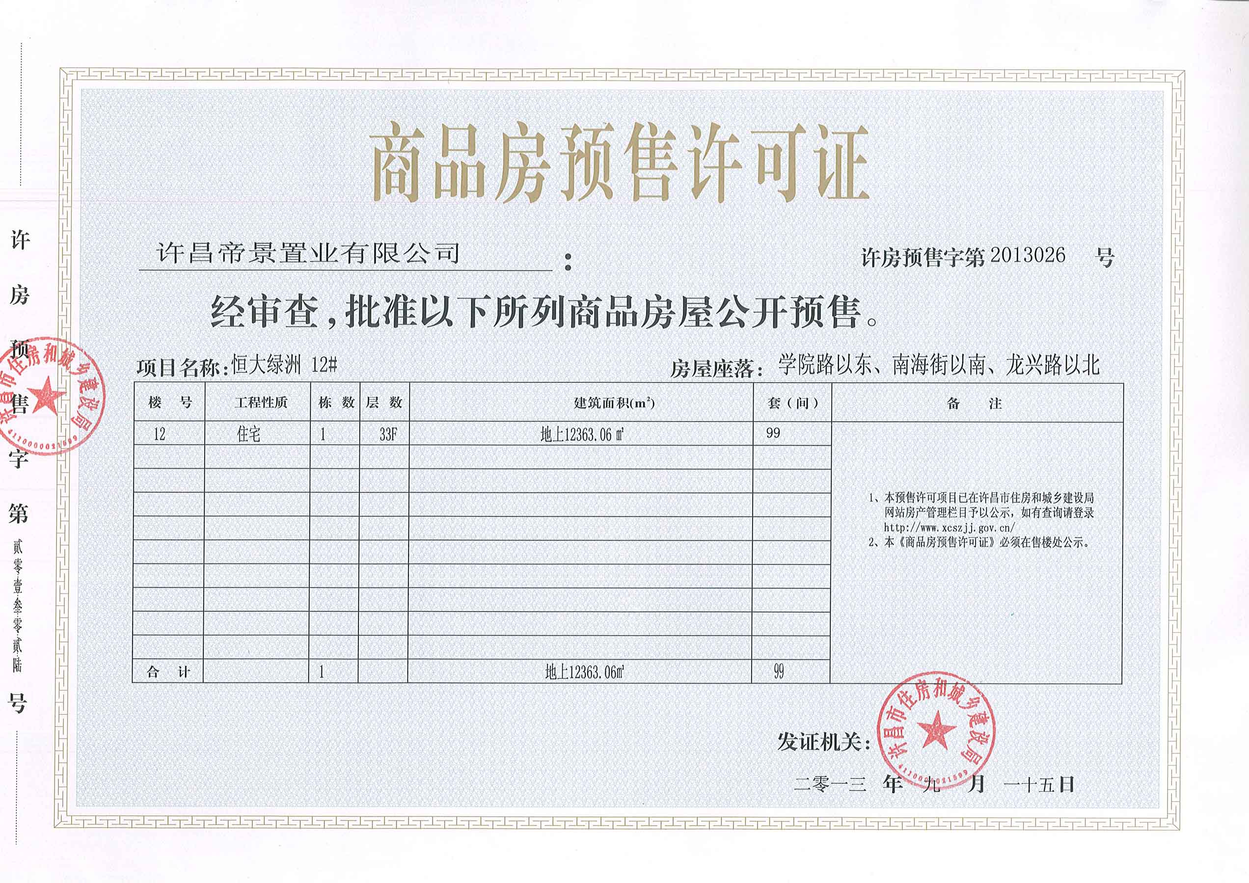 许房预售字第2013026号(许昌帝景置业有限公司)