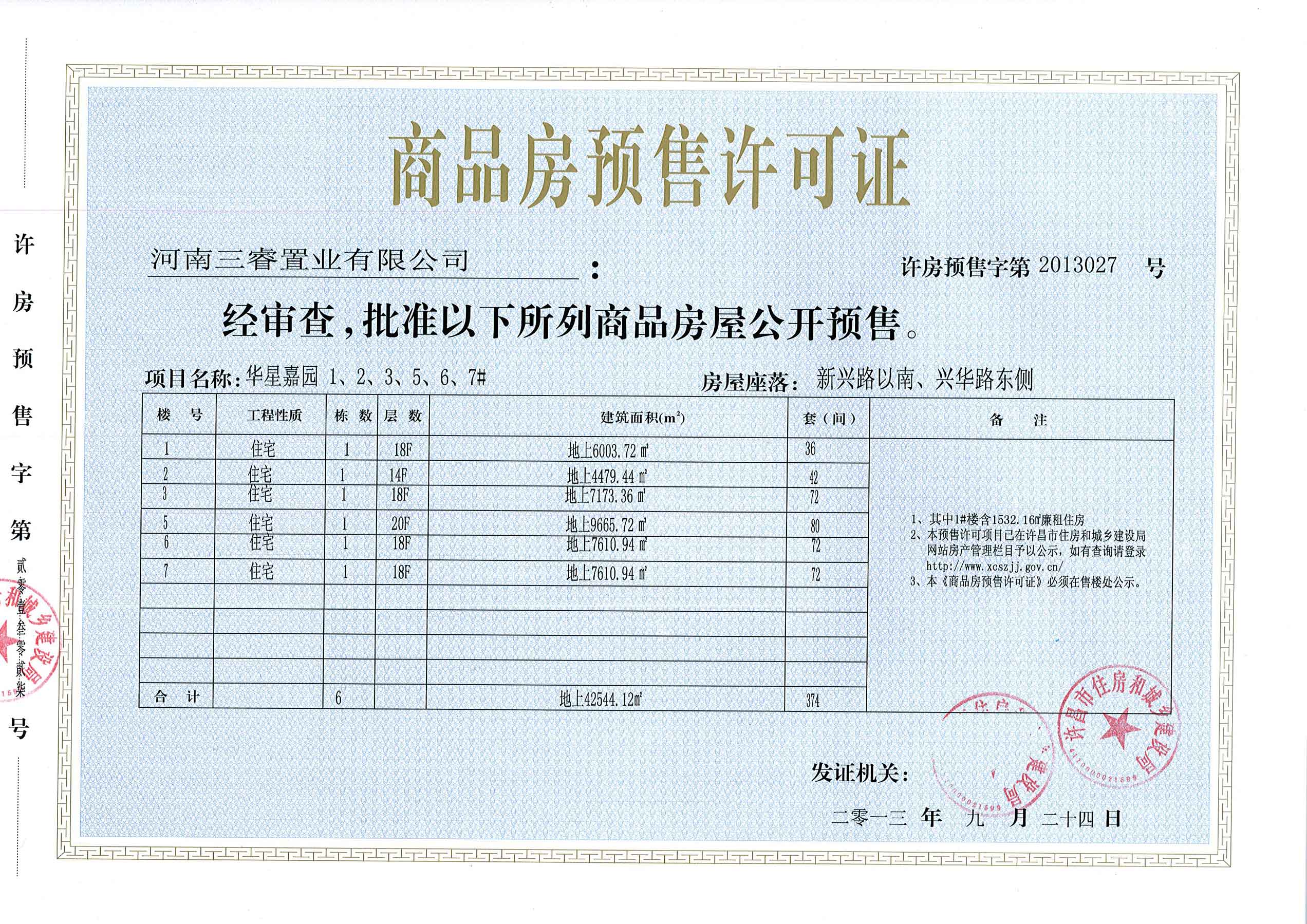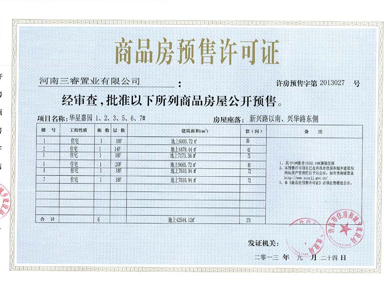 许房预售字第2013027号(河南三睿置业有限公司)