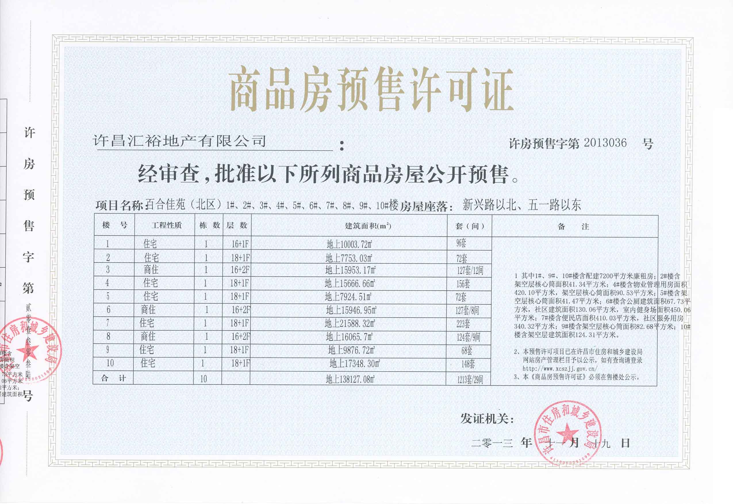 许房预售字第2013036号(许昌汇裕地产有限公司)