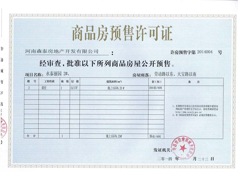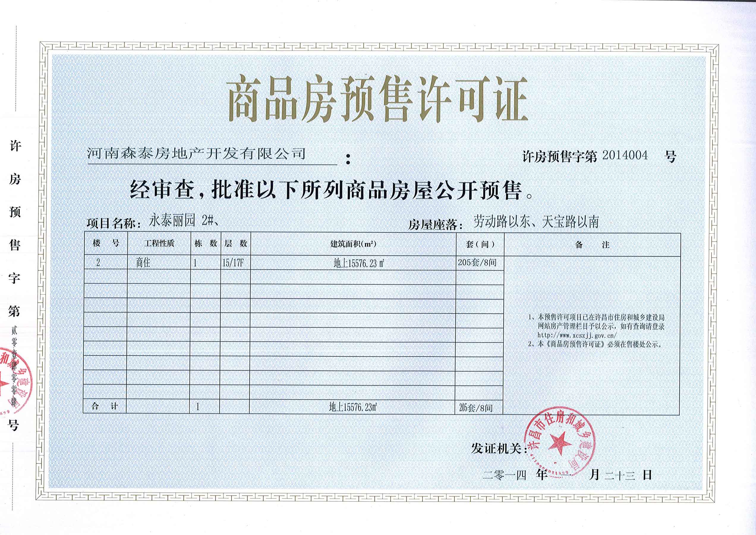 许房预售字第2014004号(河南森泰房地产开发有限公司)