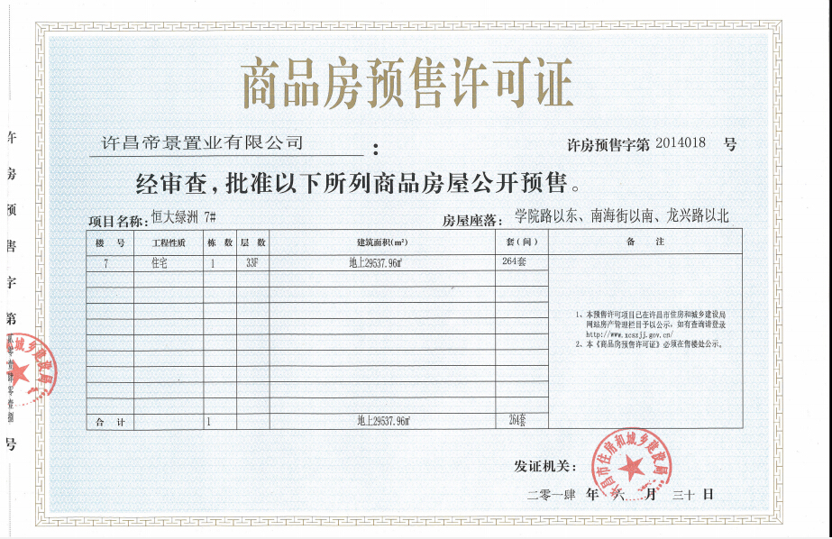 许房预售字第2014018号(许昌帝景置业有限公司)