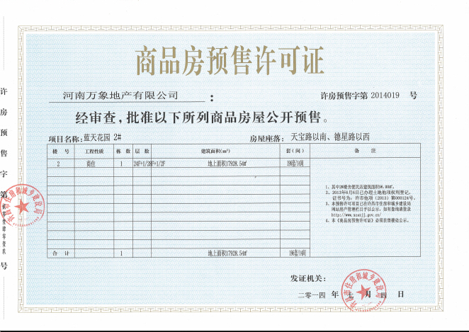 许房预售字第2014019号(河南万象地产有限公司)