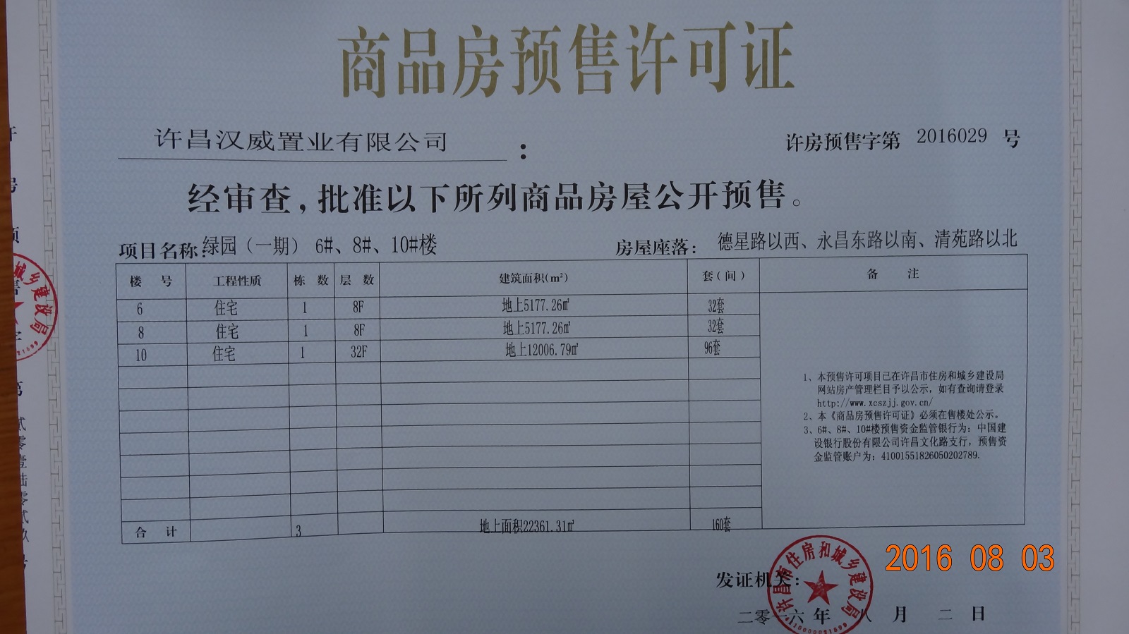 许房预售字第2016029号(许昌汉威置业有限公司)