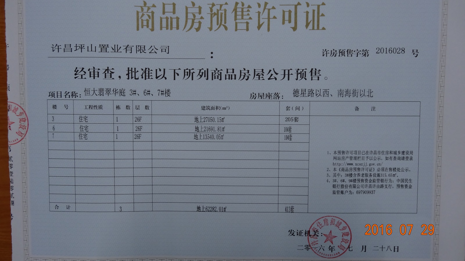许房预售字第2016028号(许昌坪山置业有限公司)