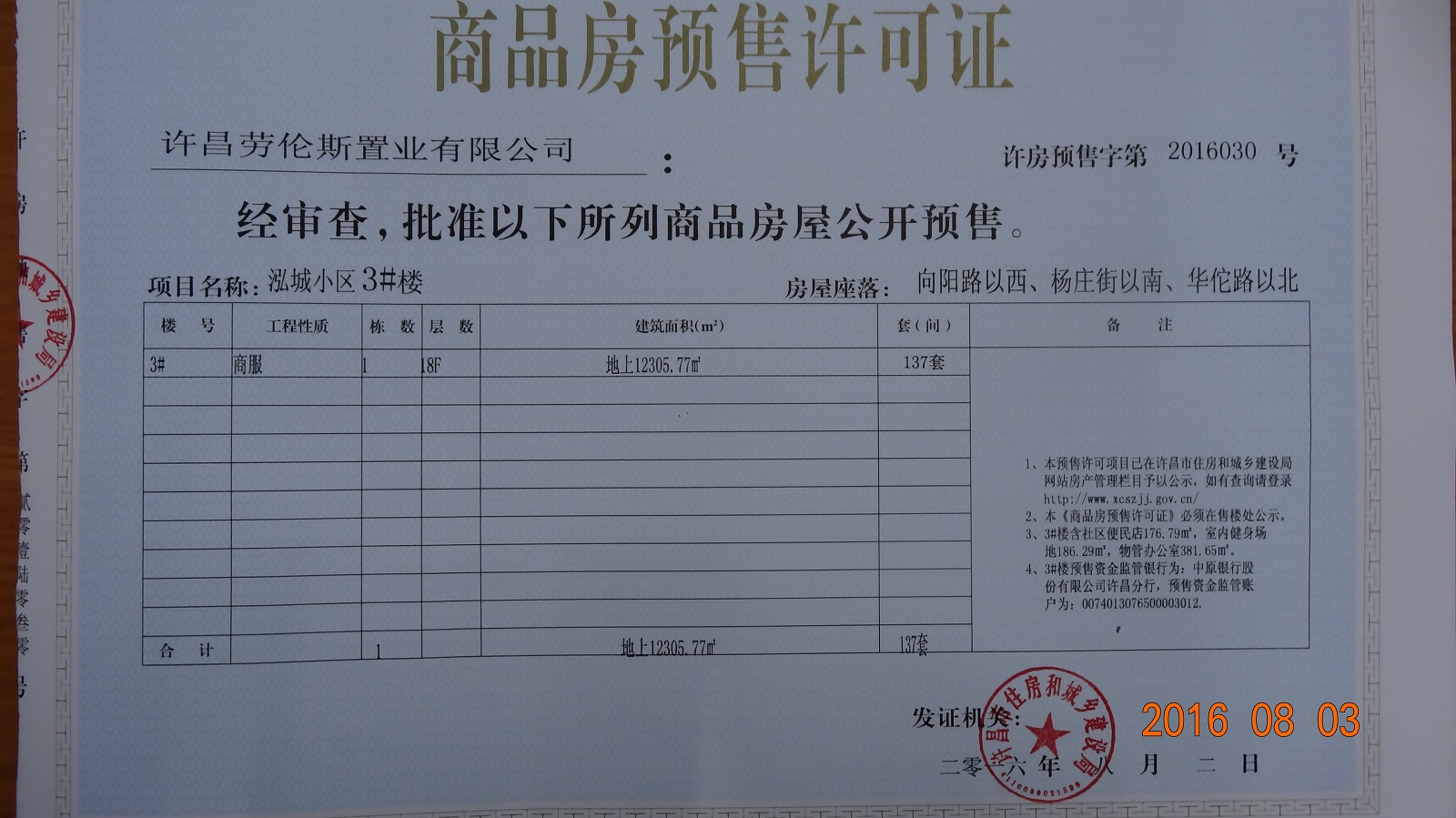 许房预售字第2016030号(许昌劳伦斯置业有限公司)