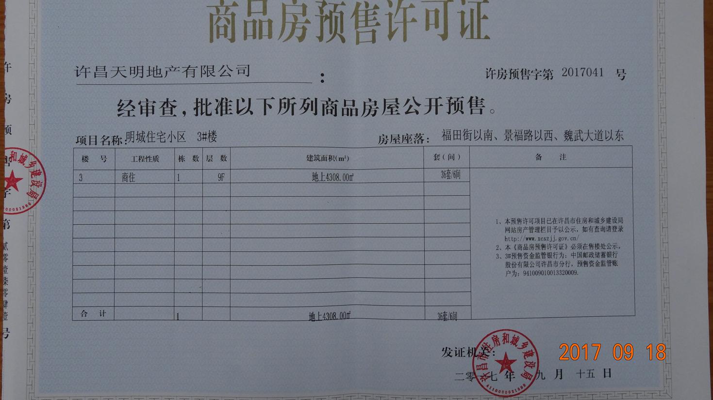 许房预售字第2017041号(许昌天明地产有限公司)