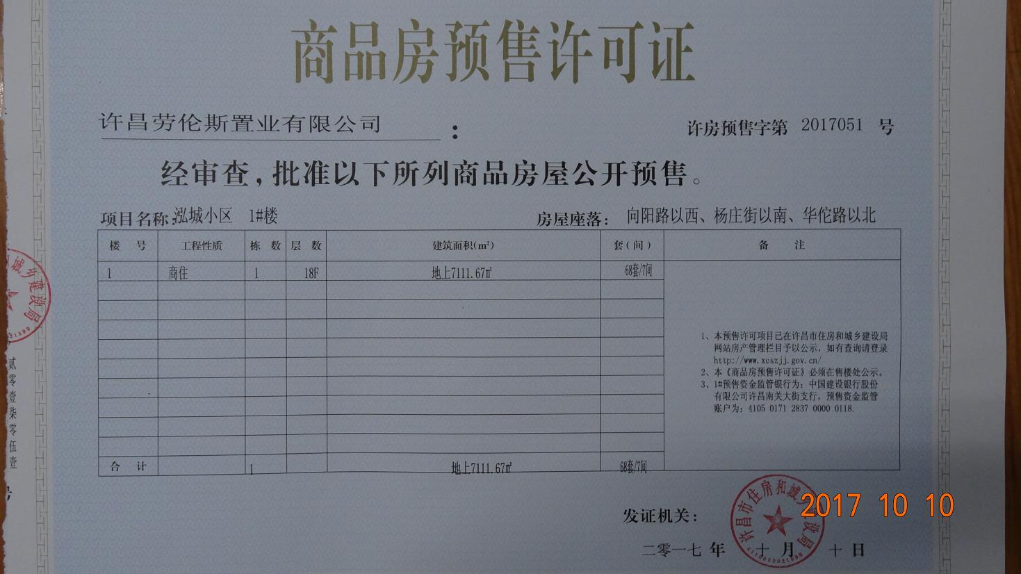 许房预售字第2017051号(许昌劳伦斯置业有限公司)