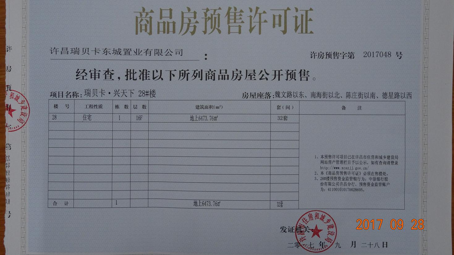 许房预售字第2017048号(许昌瑞贝卡东城置业有限公司)