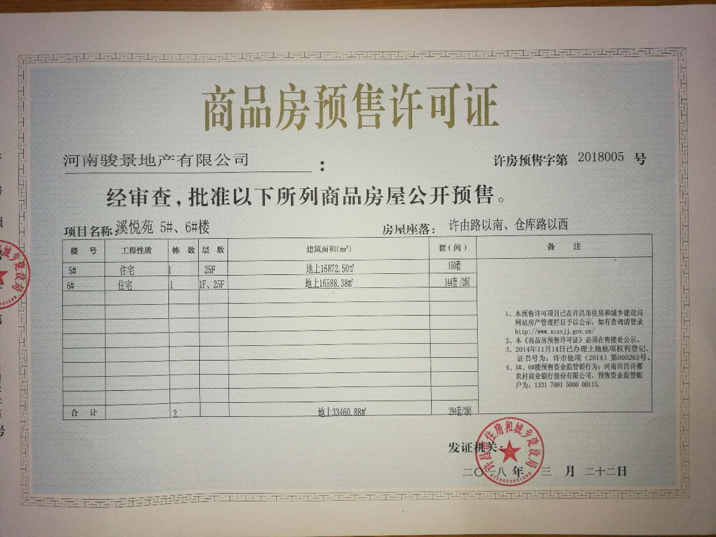 许房预售证字第2018005号(河南骏景地产有限公司)