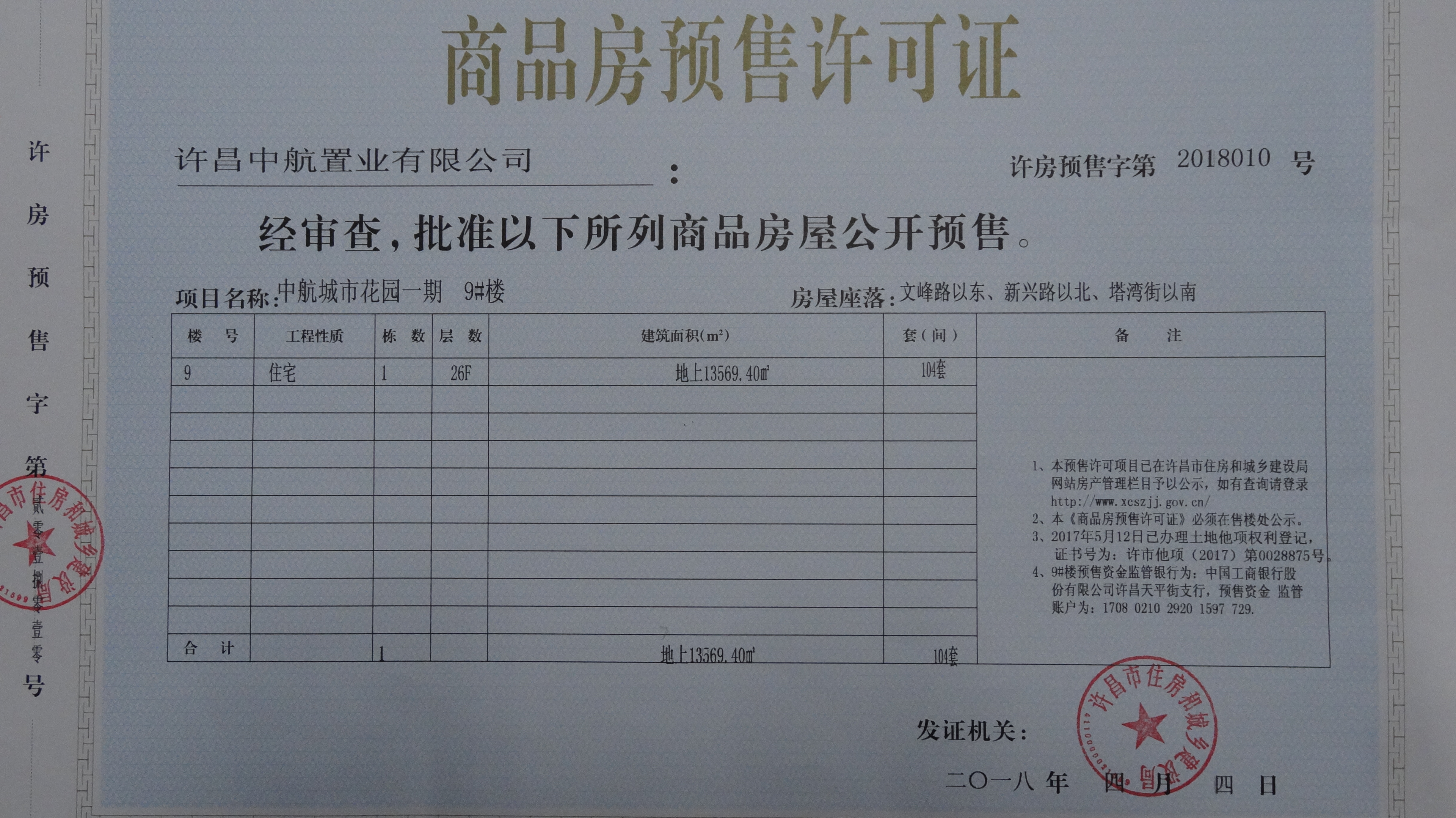 许房预售字第2018010号(许昌中航置业有限公司)