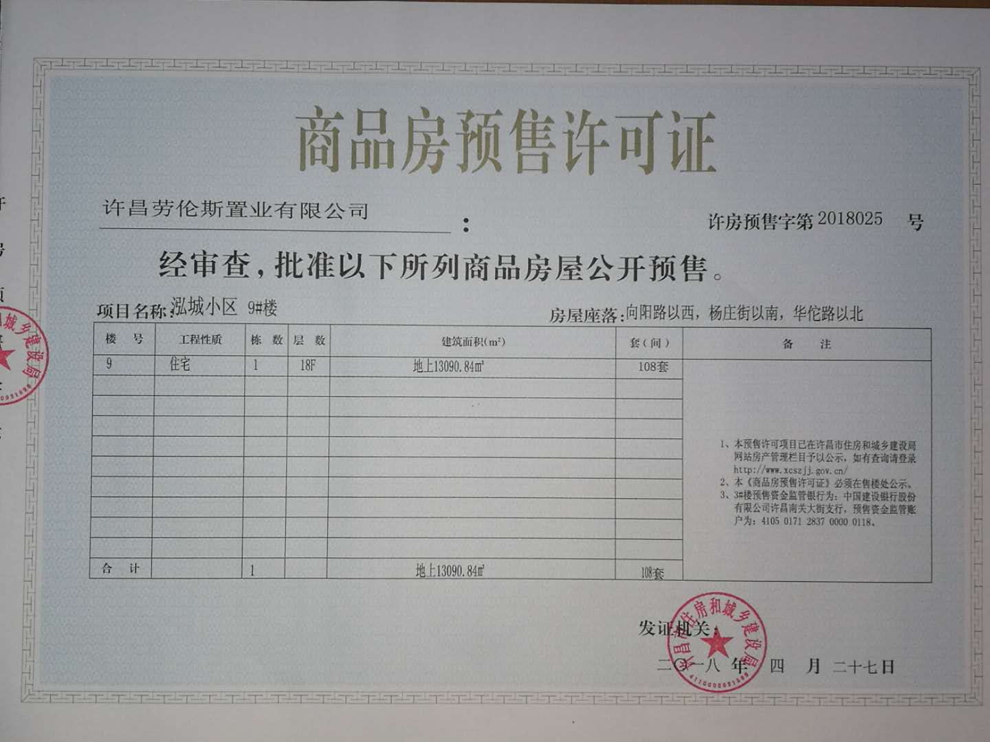 许房预售字第2018025号(许昌劳伦斯置业有限公司)