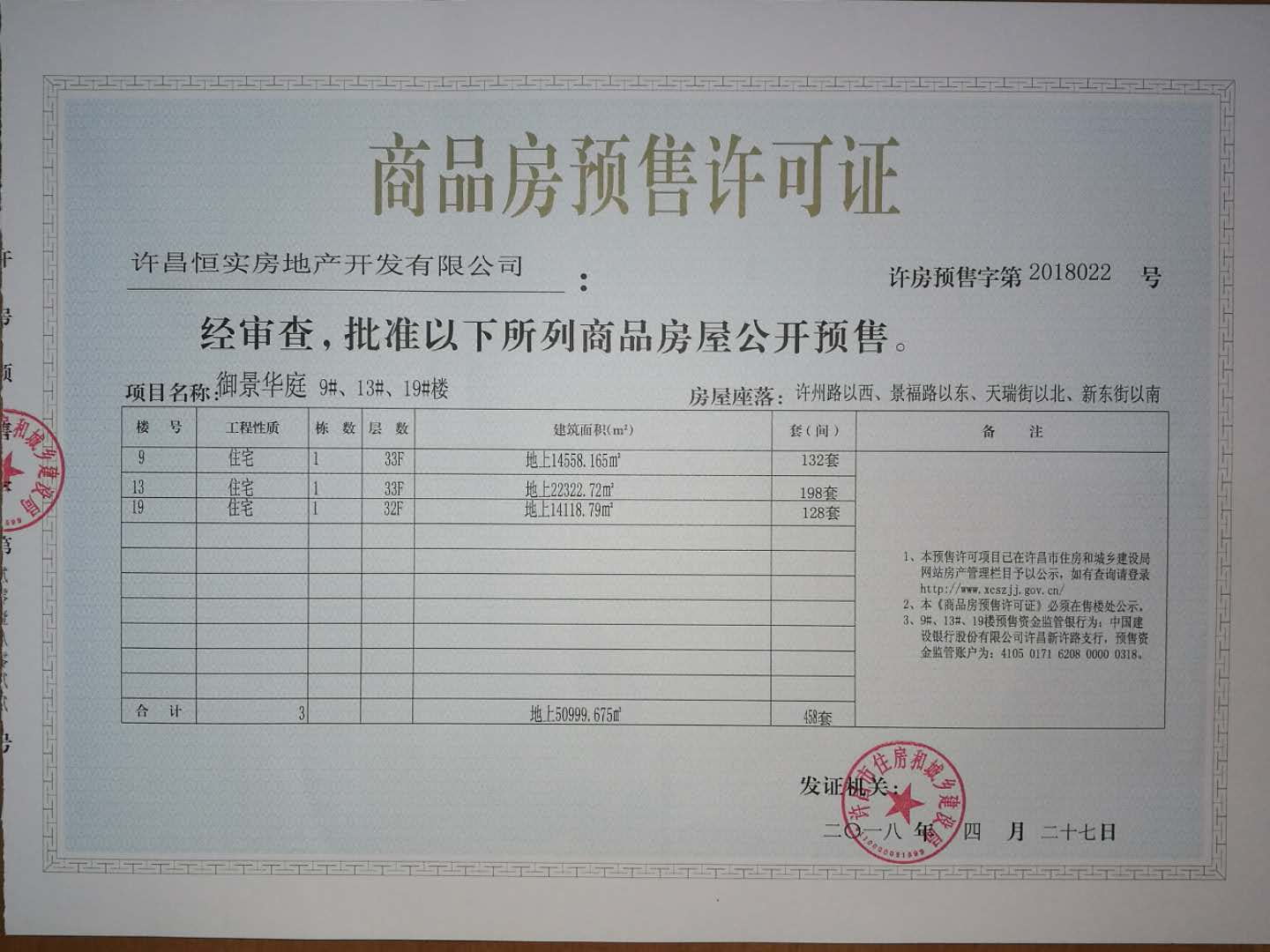 许房预售字第2018022号(许昌恒实地产开发有限公司)