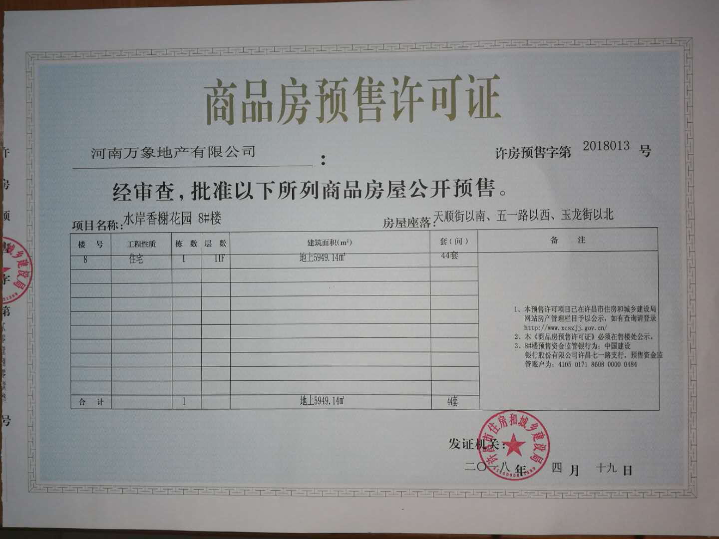 许房预售字第2018013号(河南万象地产有限公司)