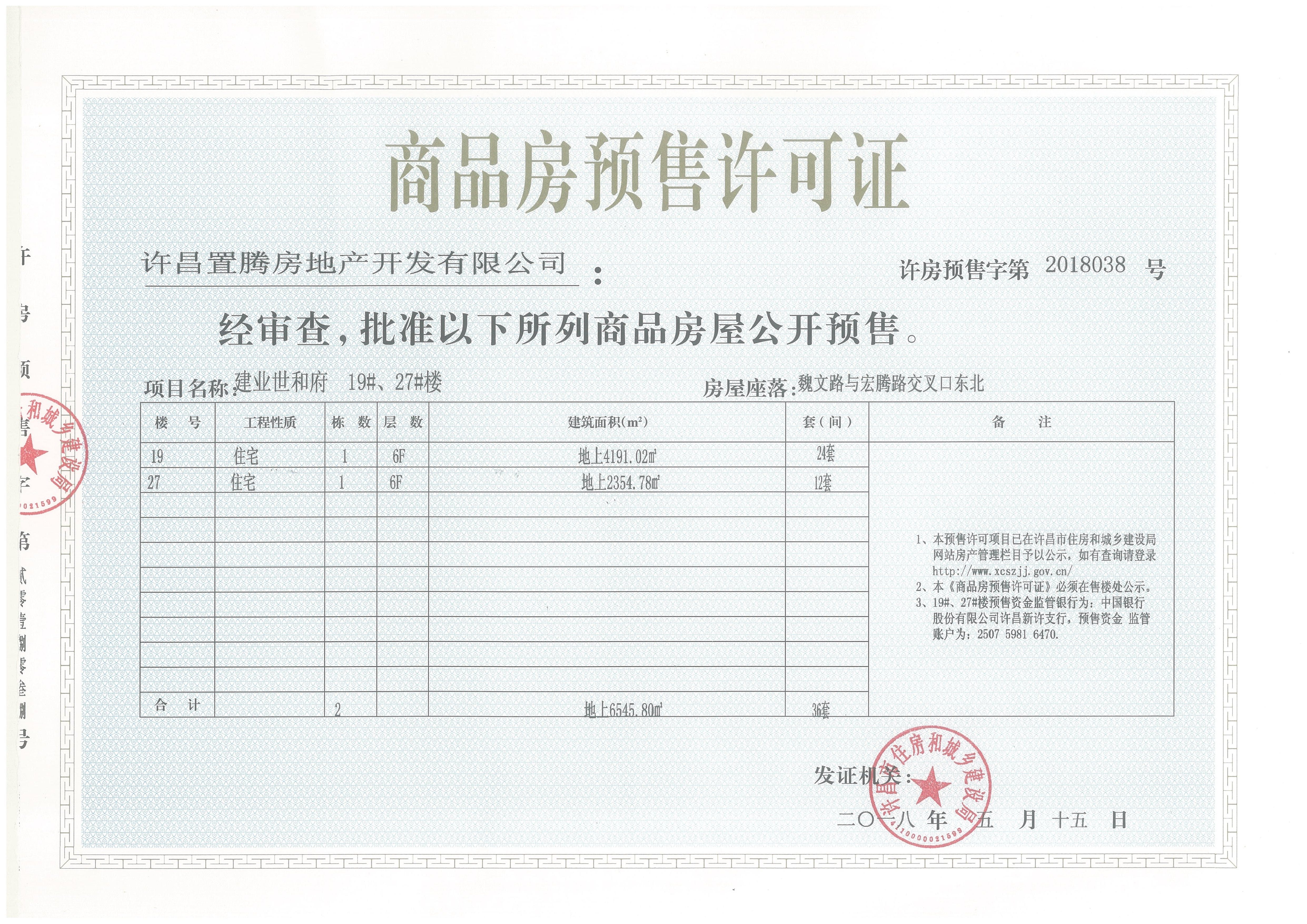 许房预售字第2018038号(许昌置腾房地产开发有限公司)