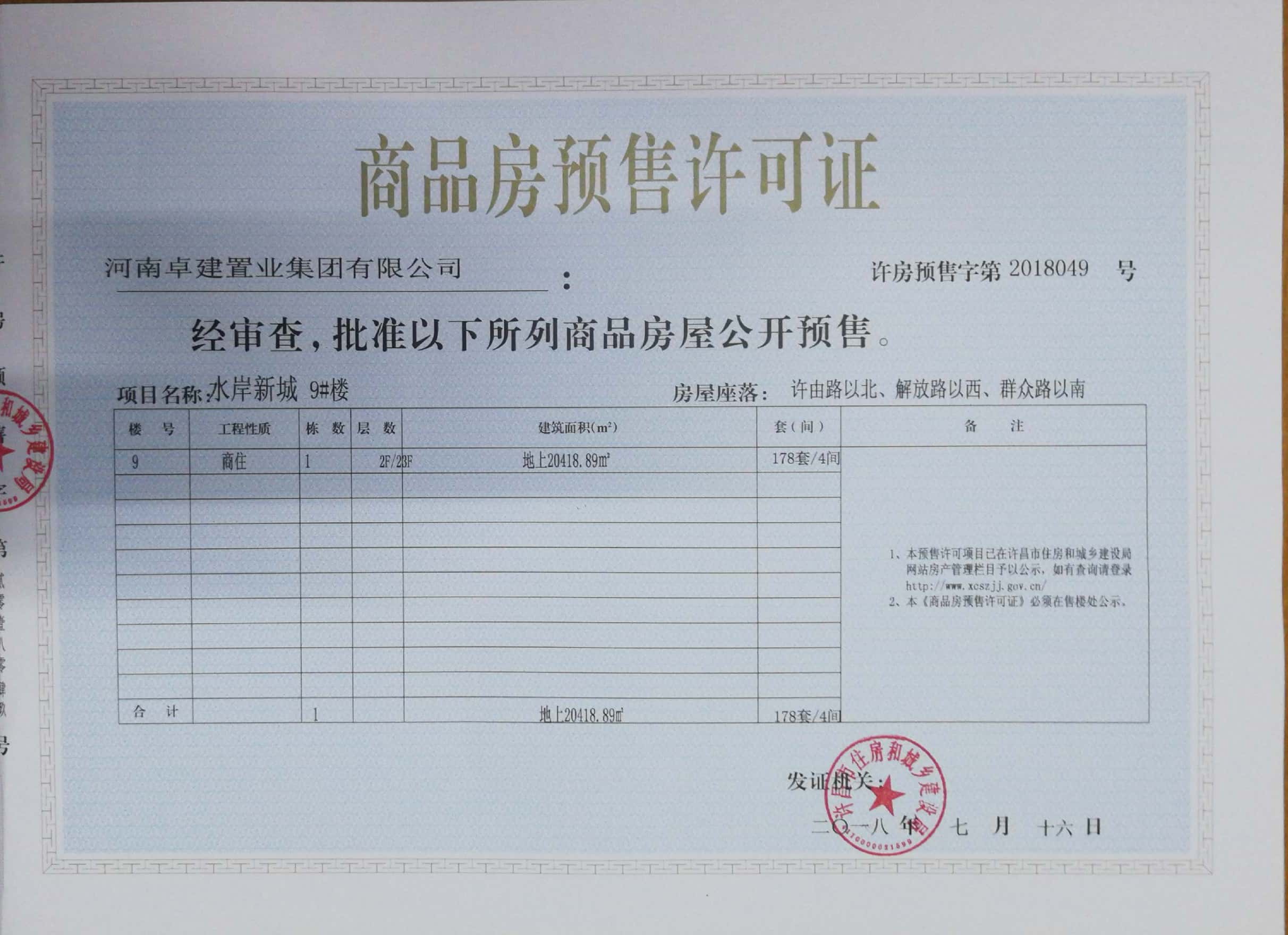 许房预售字第2018049号(河南卓建置业集团有限公司)