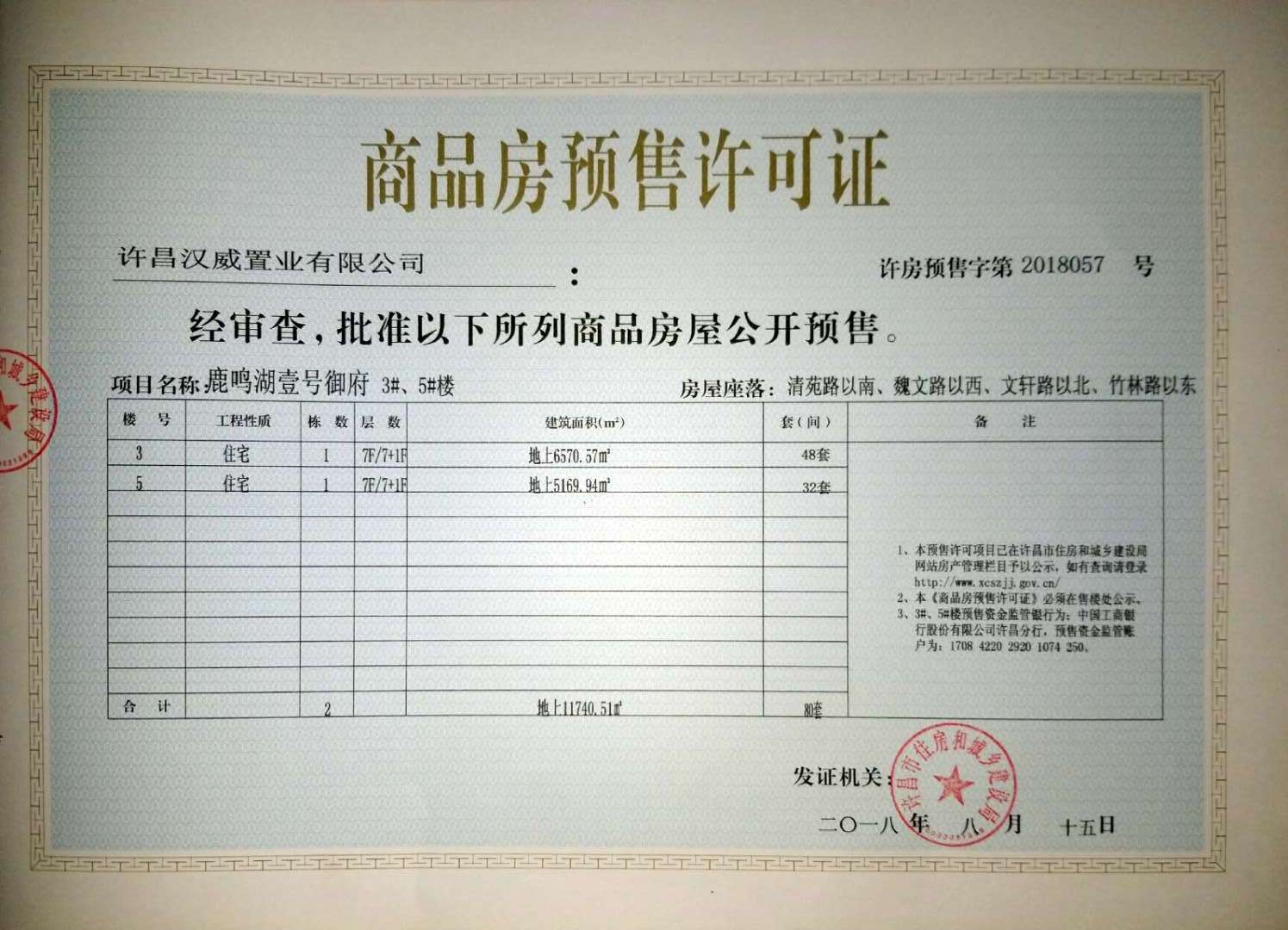 许房预售字第2018057号(许昌汉威置业有限公司)