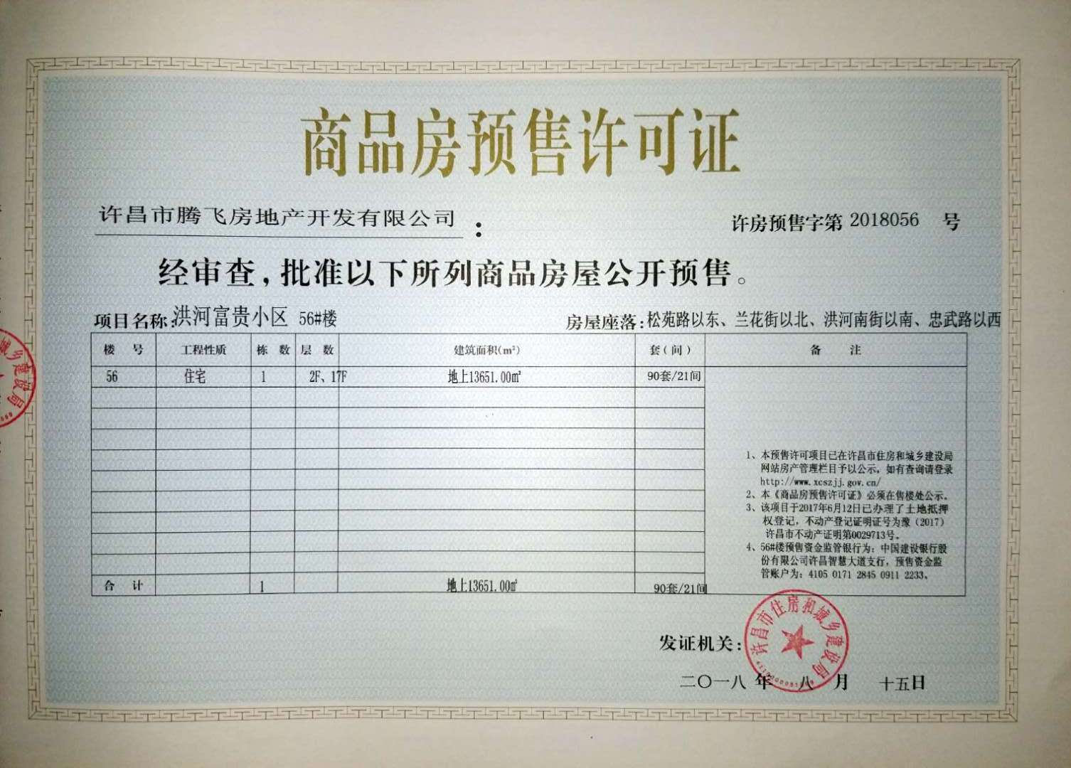 许房预售字第2018056号(许昌市腾飞房地产开发有限公司)