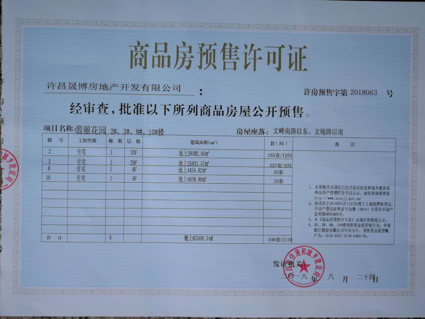 许房预售字第2018063号(许昌晟博地产开发有限公司)