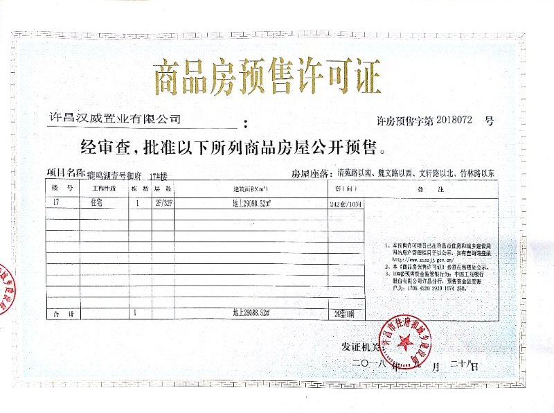 许房预售字第2018072号(许昌汉威置业有限公司)