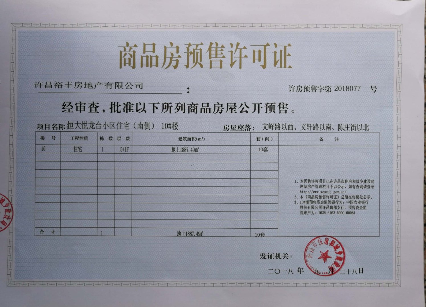 许房预售字第2018077号(许昌裕丰房地产有限公司)