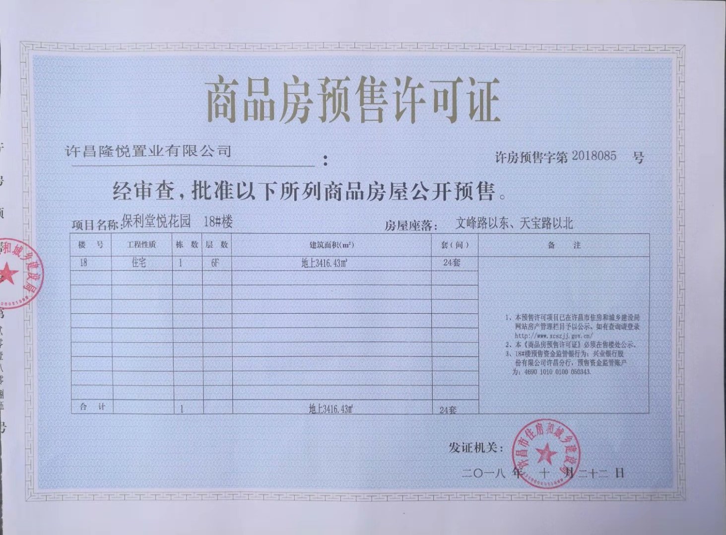 许房预售字第2018085号(许昌隆悦置业有限公司)