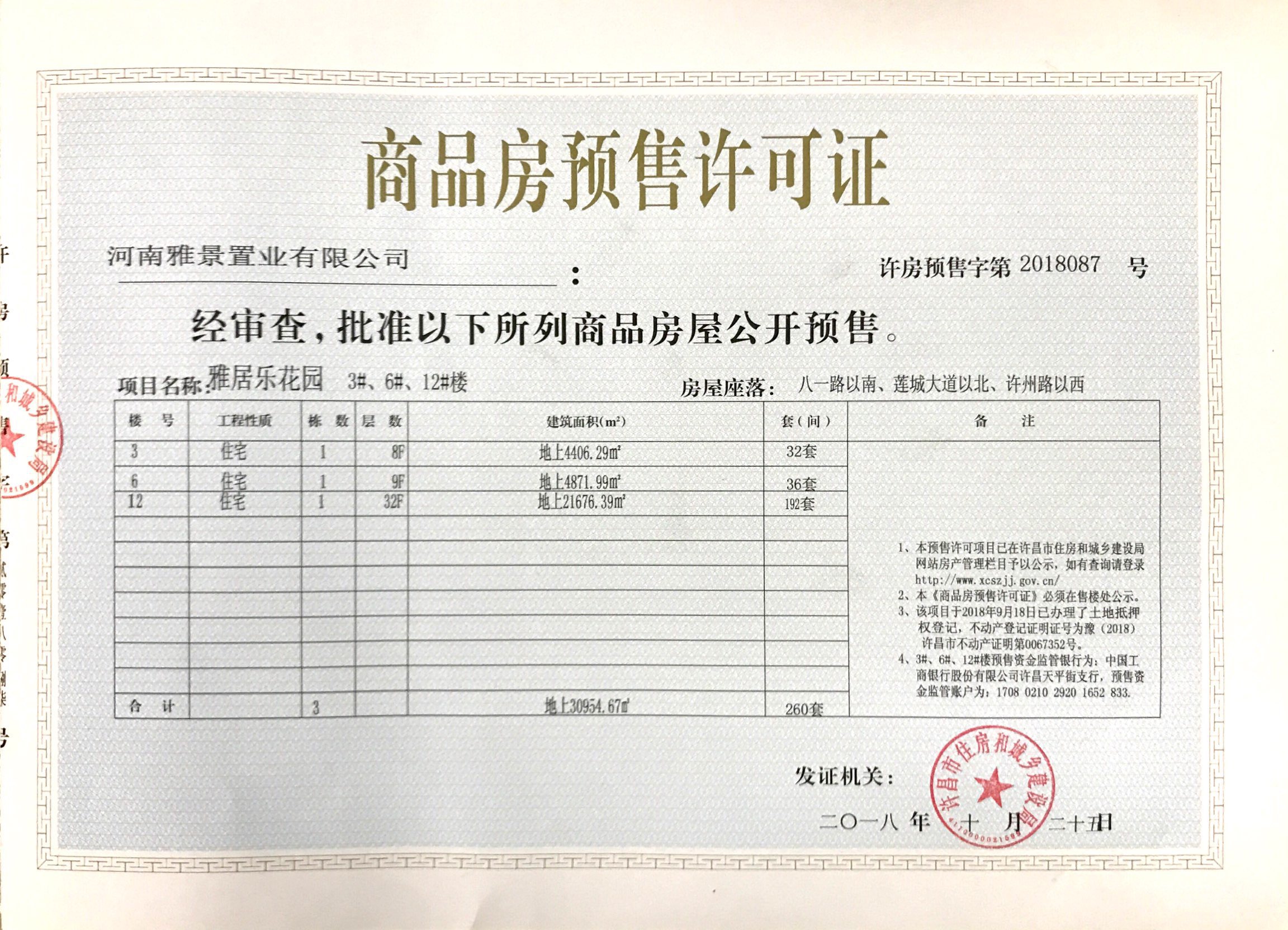 许房预售字第2018087号(河南雅景置业有限公司)