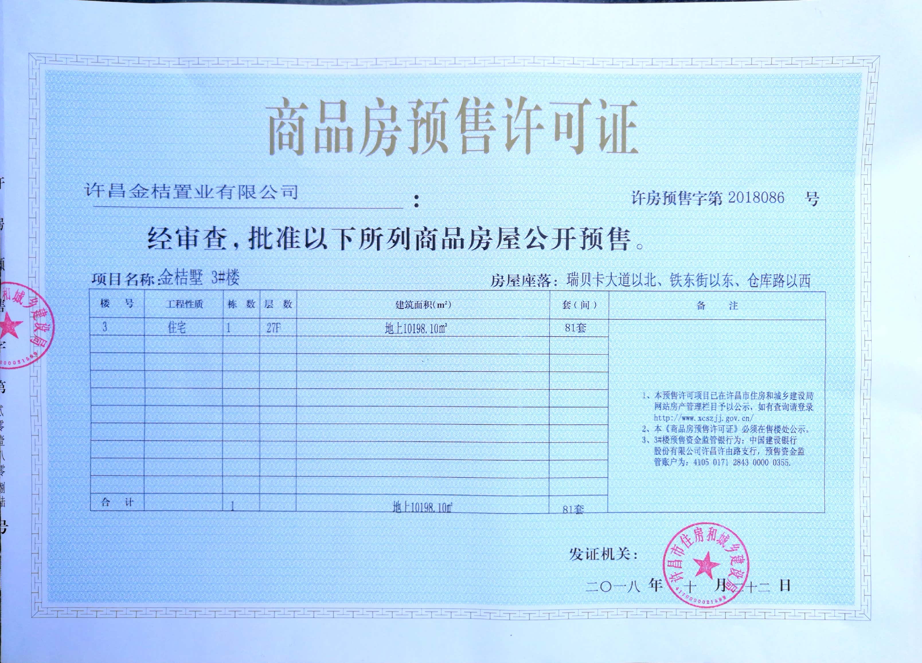 许房预售字第2018086号(许昌金桔置业有限公司)