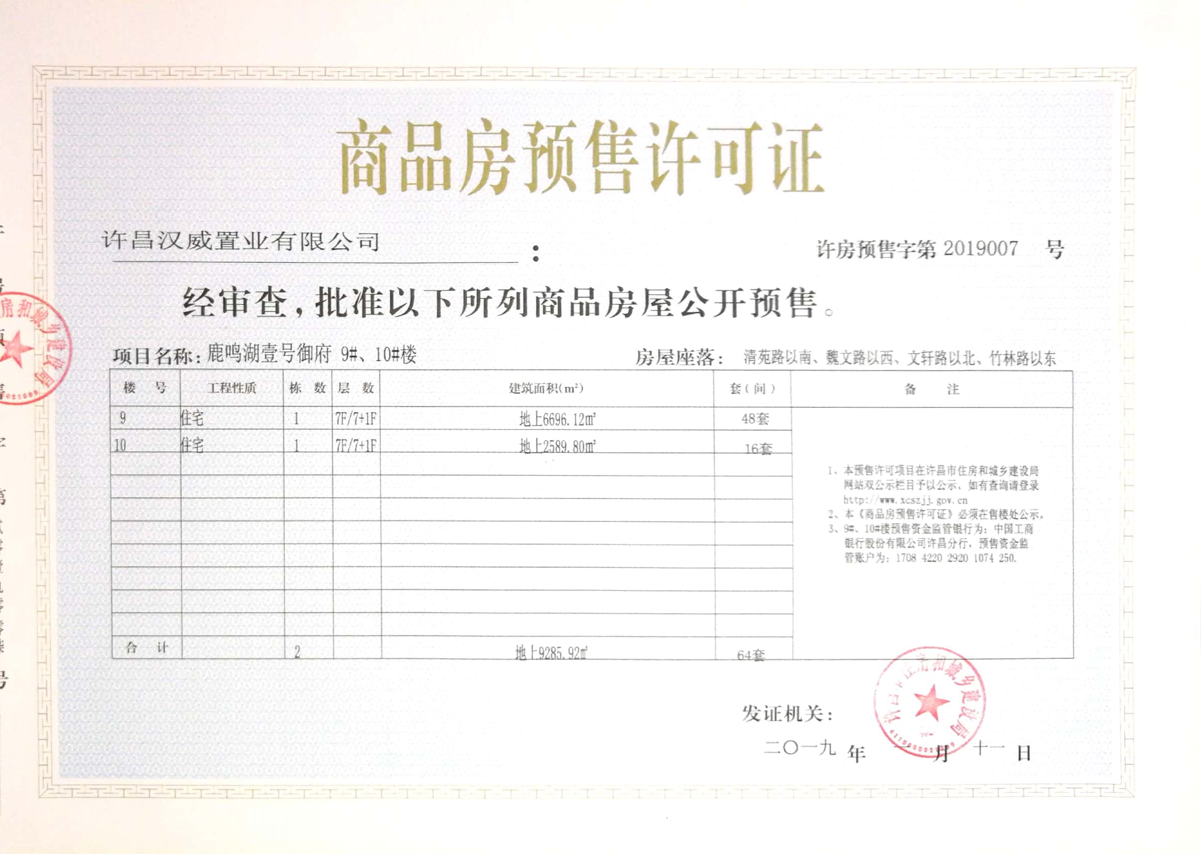 许房预售字第2019007号(许昌汉威置业有限公司)
