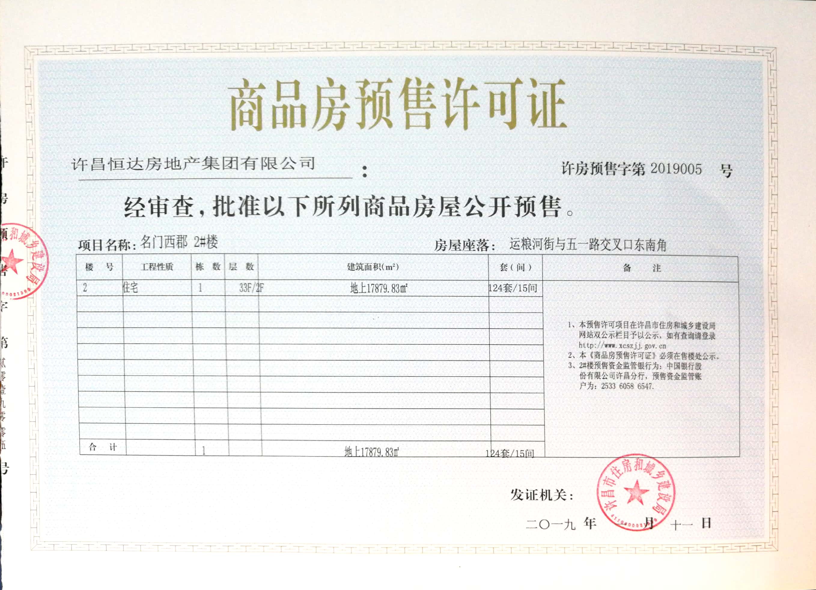 许房预售字第2019005号(许昌恒达房地产集团有限公司)
