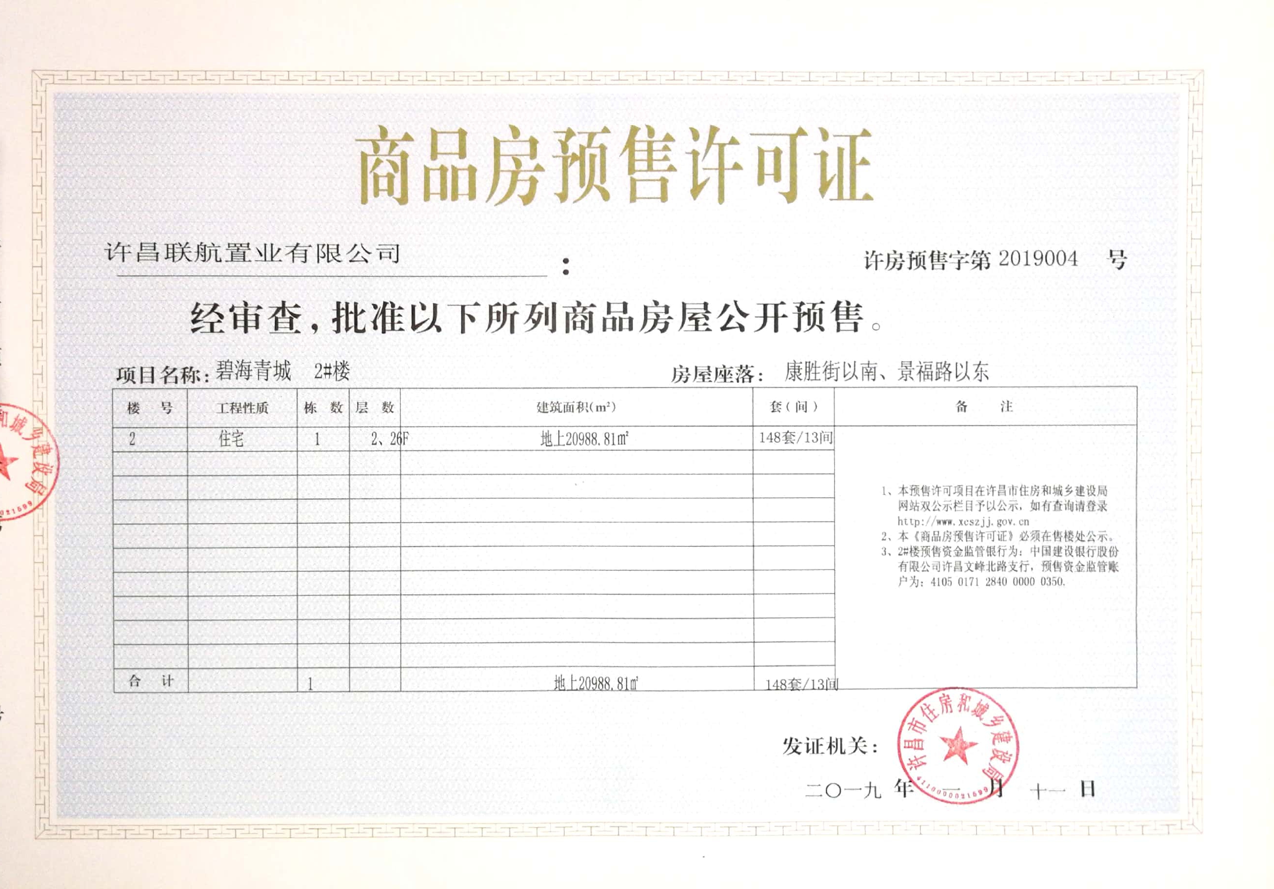 许房预售字第2019004号(许昌联航置业有限公司)