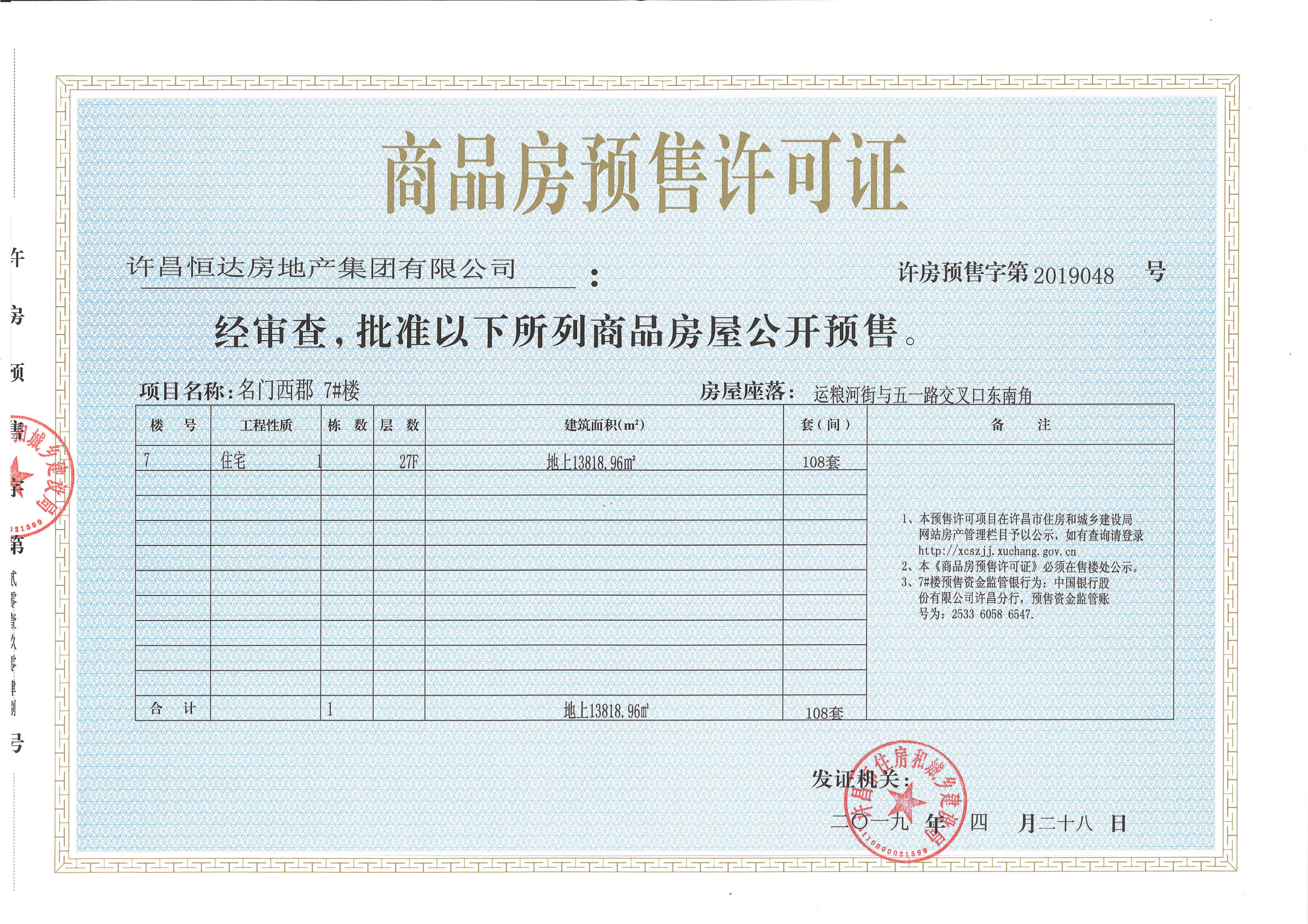 许房预售字第2019048号(许昌恒达房地产集团有限公司)
