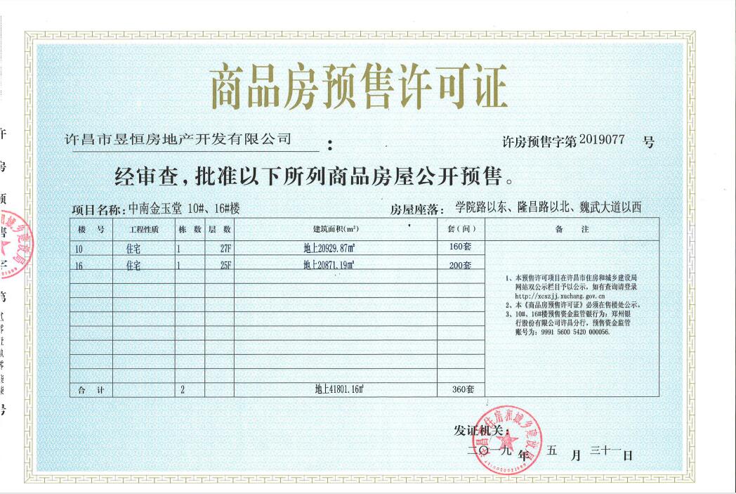 许房预售字第2019077号(许昌市昱恒房地产开发有限公司)