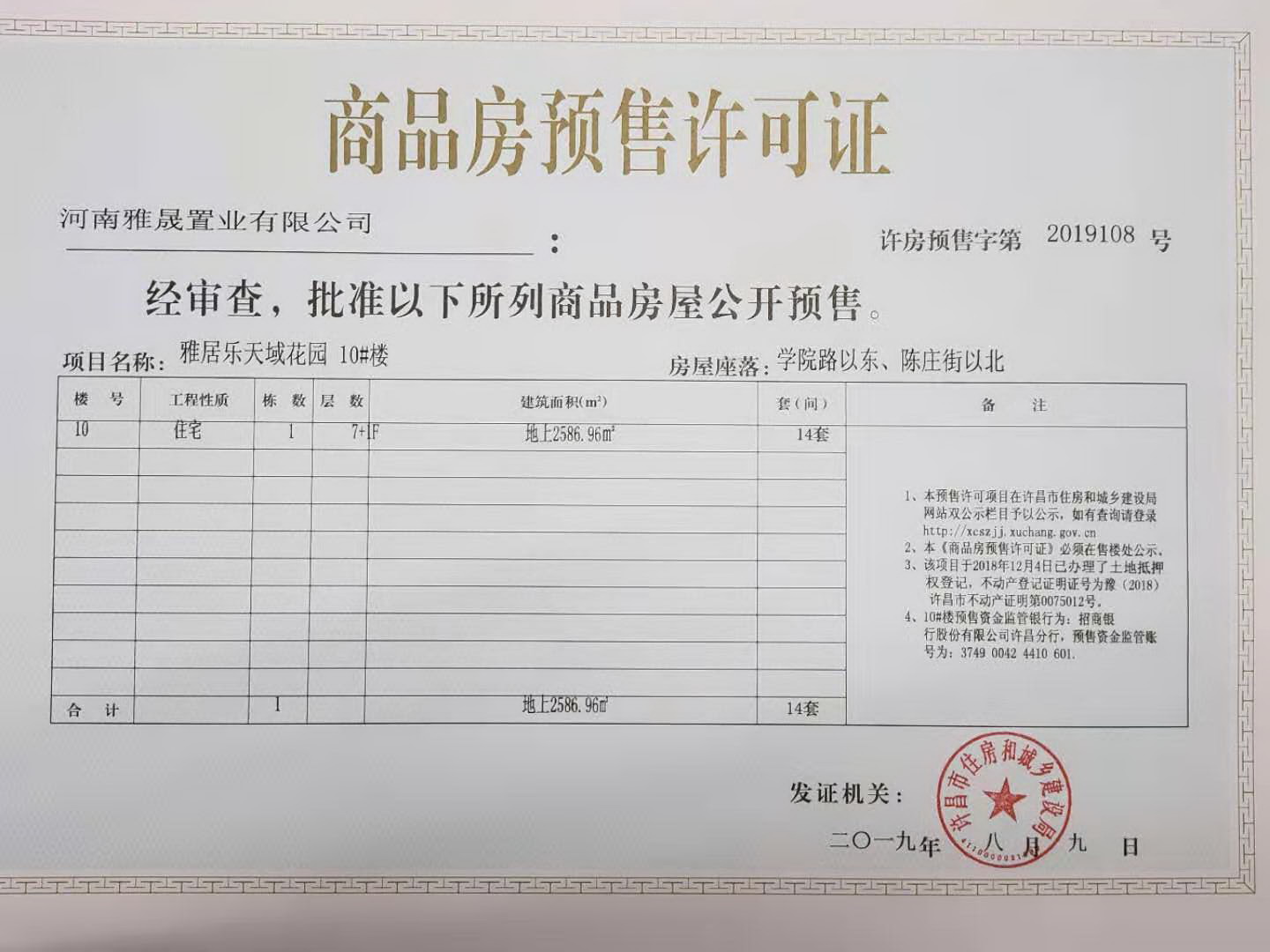许房预售字第2019108号(河南雅晟置业有限公司)