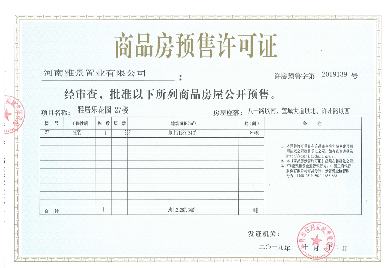 许房预售字第2019139号(河南雅景置业有限公司)