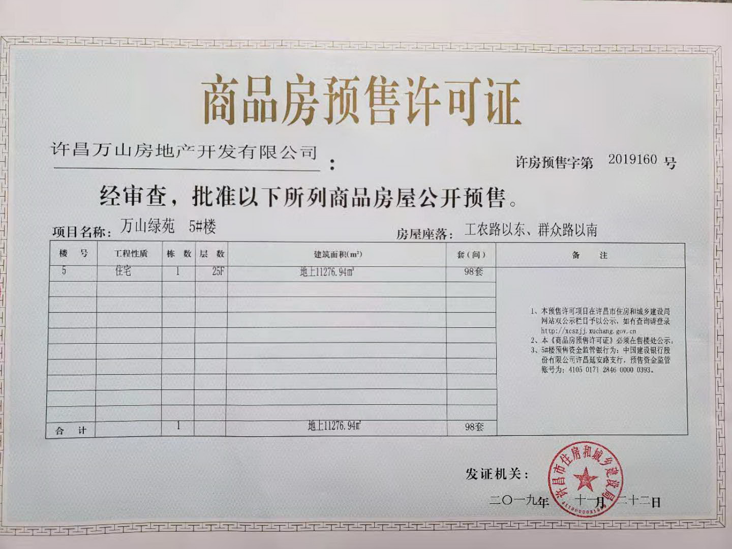 许房预售字第2019160号(许昌万山房地产开发有限公司)
